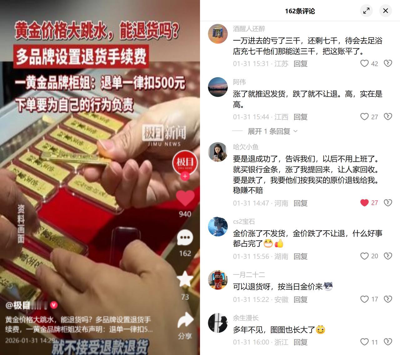 金价大跌,退单被硬扣500 最近金价大跳水,不少之前下单买黄金的消费者想退单,却被多家品牌设高额手续费,有的直接扣500,还拿下单要负责说事,这事儿把黄金消费里的双标规则给暴露得明明白白。 你仔细品品就懂,这行业的规则弹性全捏在商家手里。之前金价涨的时候,有些商家要么拖着不发货等更高价,要么偷偷换克重不足的货,消费者找上门就各种打太极;现在跌了,立马把契约精神挂嘴边,卡退货、扣费用,半点儿余地都不给。 按规定,网络买的黄金首饰并没被列入不能无理由退的范围,但很多商家就单方面标不退不换,连个消费者确认的程序都没有,说白了就是吃准了普通人嫌维权麻烦。 你有没有遇到过这种赢了全拿,输了全推的双标操作?