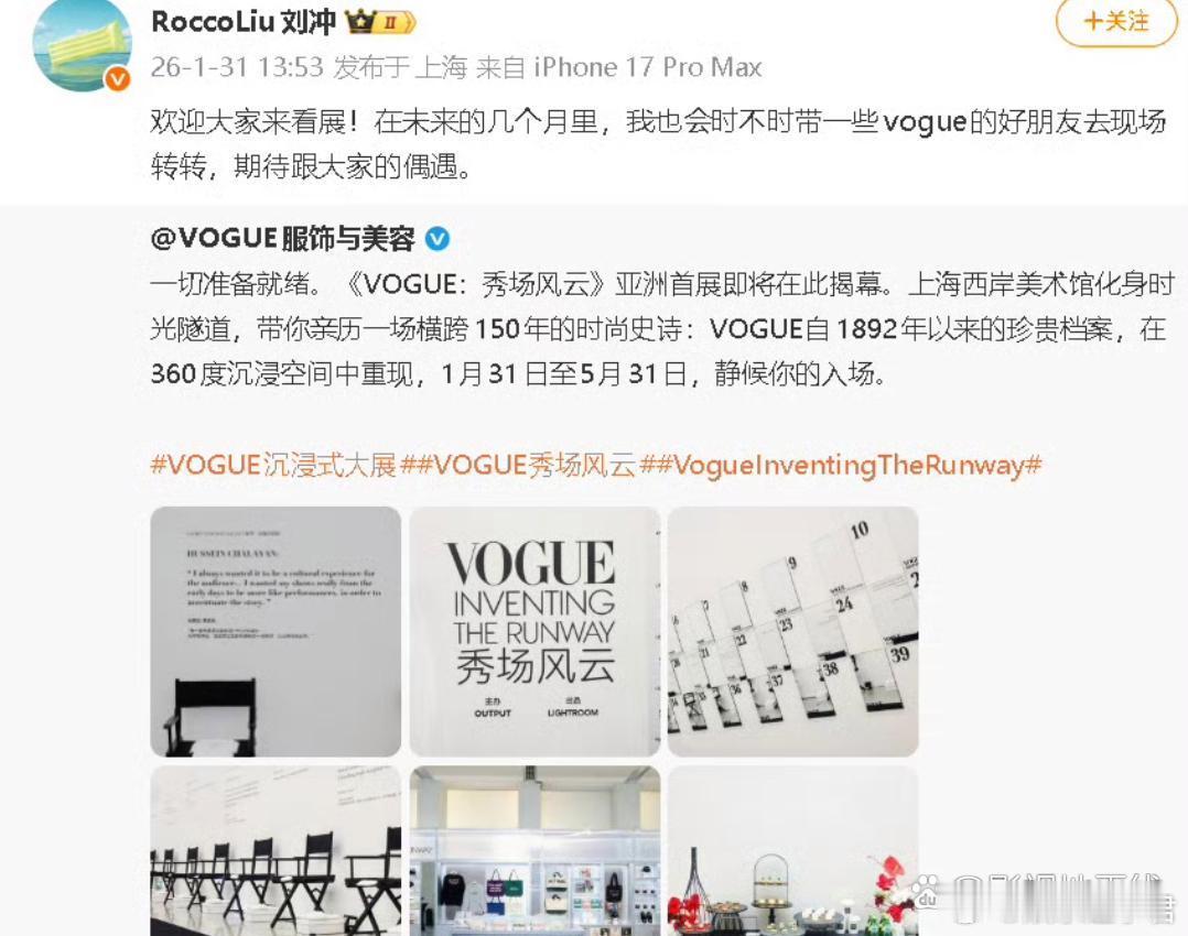 31日, 网传刘冲被VOGUE辞了,他发文:“在未来的几个月里,我也会时不时带一些vogue的好朋友去现场转转,期待跟大家的偶遇。”疑似否认此事。