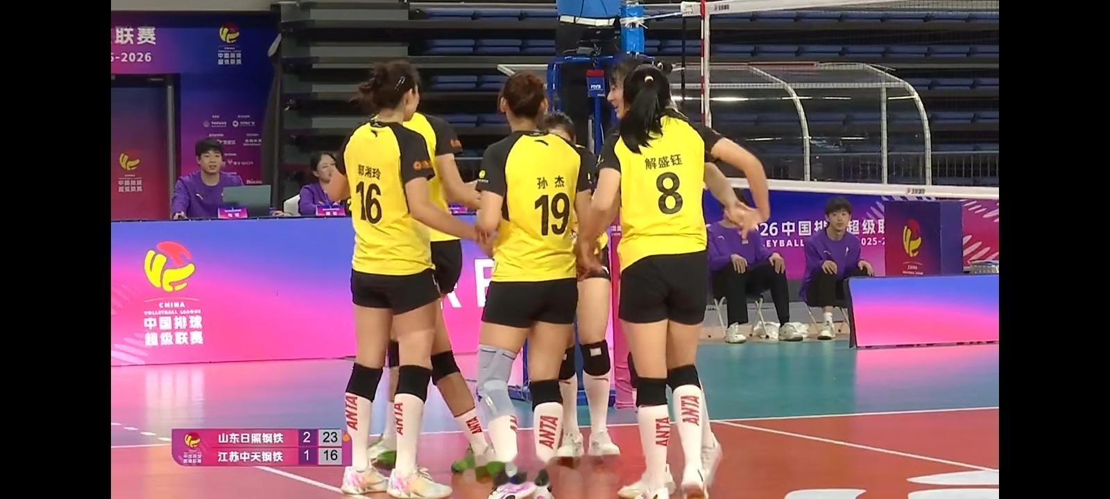 排超联赛 山东女排3比1江苏女排,第四局江苏女排最后追分,杨佳追发前排的李晨暄,然后一传不到位之下,江苏吴梦洁前排连续反击下球,一直到最后李晨暄自接自扣拿下!中国女排 排球 中国女排