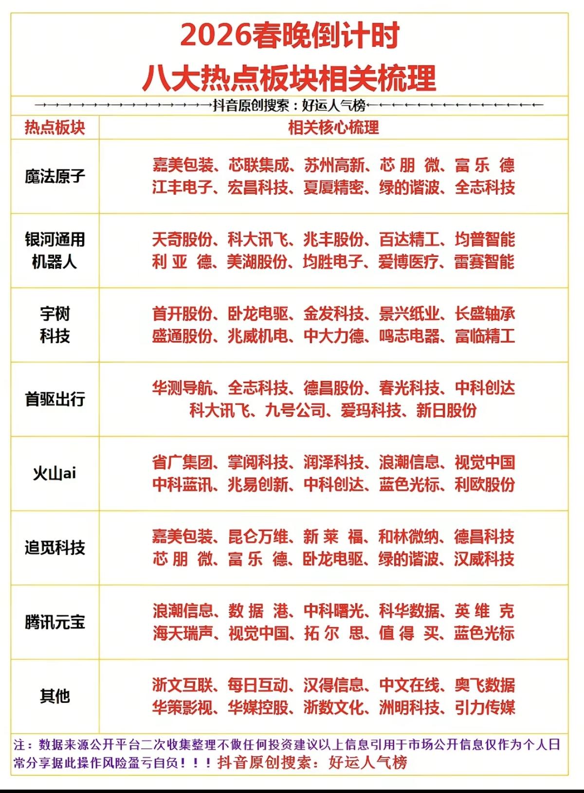 2026年春晚倒计时! 八大热点板块核心梳理! 1.魔法原子 2.银河通用机器人 3.宇树科技 4.首区出行 5.火山AI 6.追觅科技 7.腾讯元宝 8.影视院线,文化传媒
