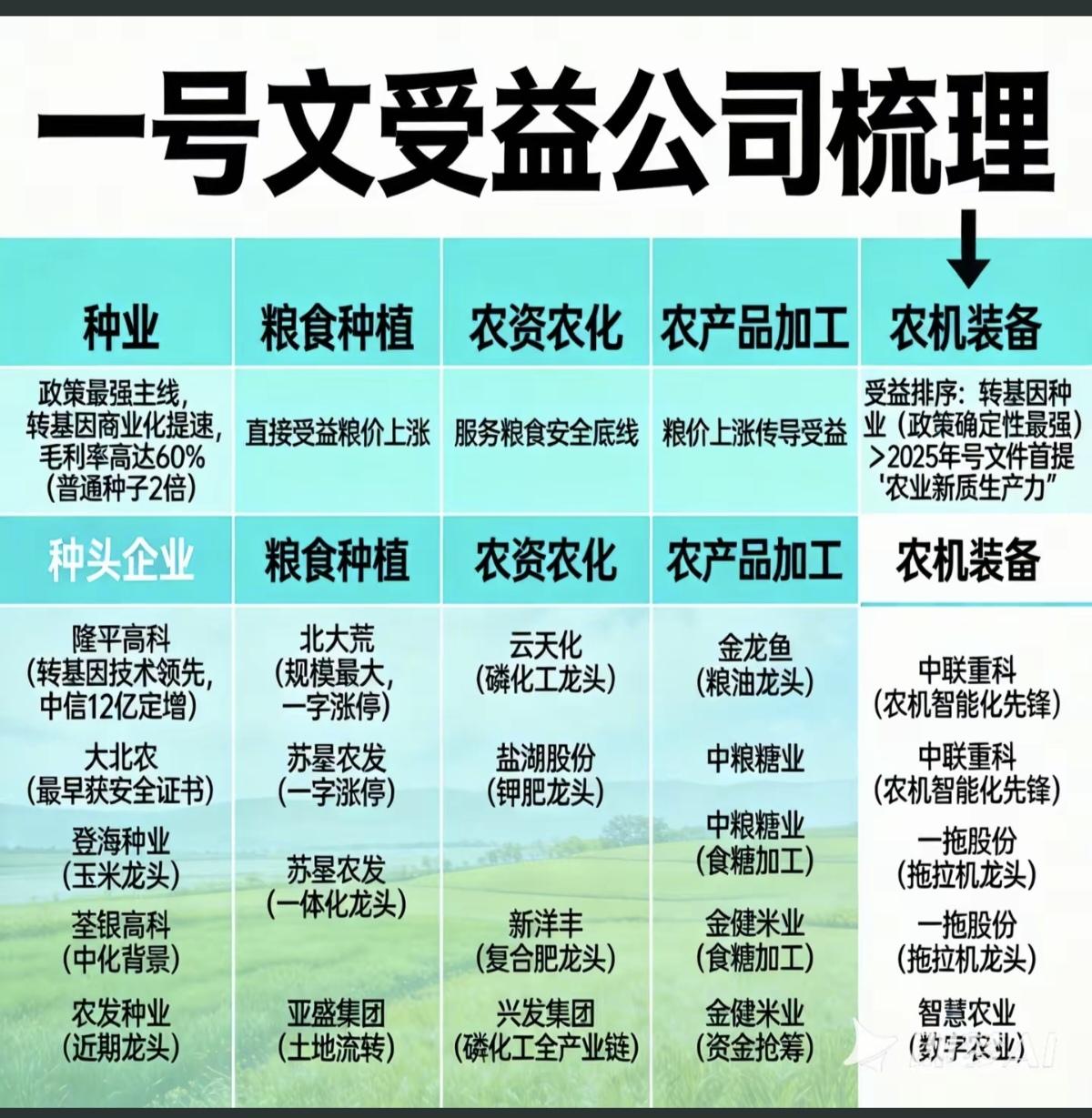 农业一号文件即将出台:核心龙头股! 十五五开局之年,农业一号文件即将出台,此次尤为重要。 种业、粮食种植、农机装备、化肥、农产品加工。 相关核心龙头受益股: