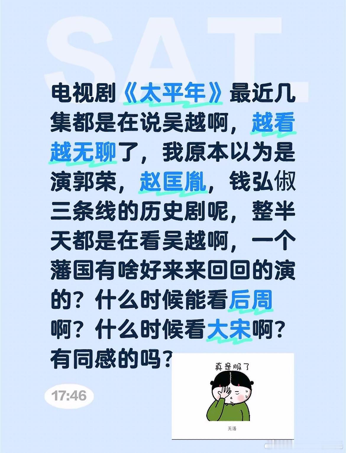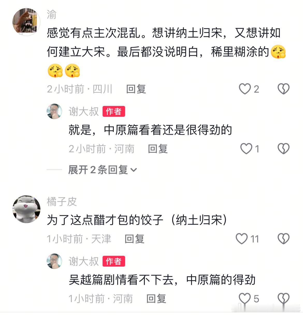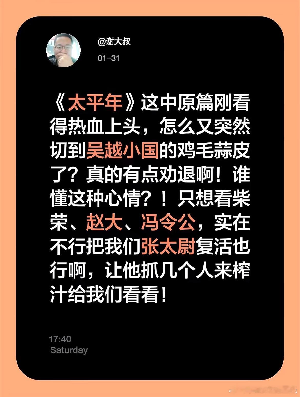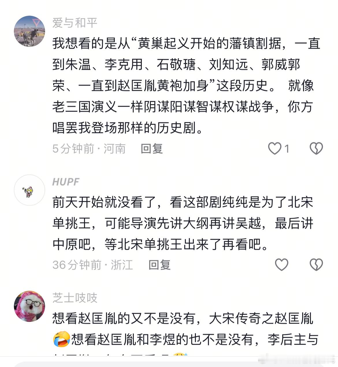 太平年 中原戏份过于精彩,就会觉得吴越较为平淡,这是江浙沪观众外普遍感知吧~虽然江南内政和权谋有时也不错,但总感觉少点什么~有上海观众说“浙江出了钱当然要吹吴越”,这挺无语的……如果好好以中原为唯一主线,从黄巢起义开始,各种人物,你方唱罢我登场,直到大宋统一各国,不知道有多精彩~~