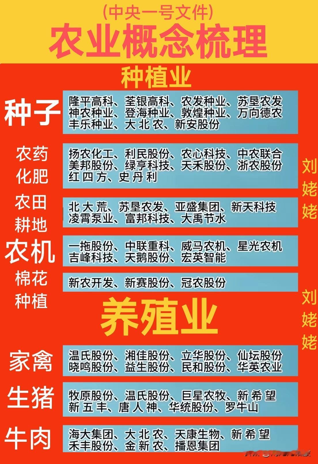 “农业概念”周五逆势长虹。预估与一号文件预期相关。农业概念梳理如下。 关注“刘姥姥”,精彩分享真不少(麻烦亲们:点赞,收藏,分享)。 特别提醒:本文涉及内容及个股,仅供交流与参考,不是荐股,不得以此作为买卖依据,盈亏自负。