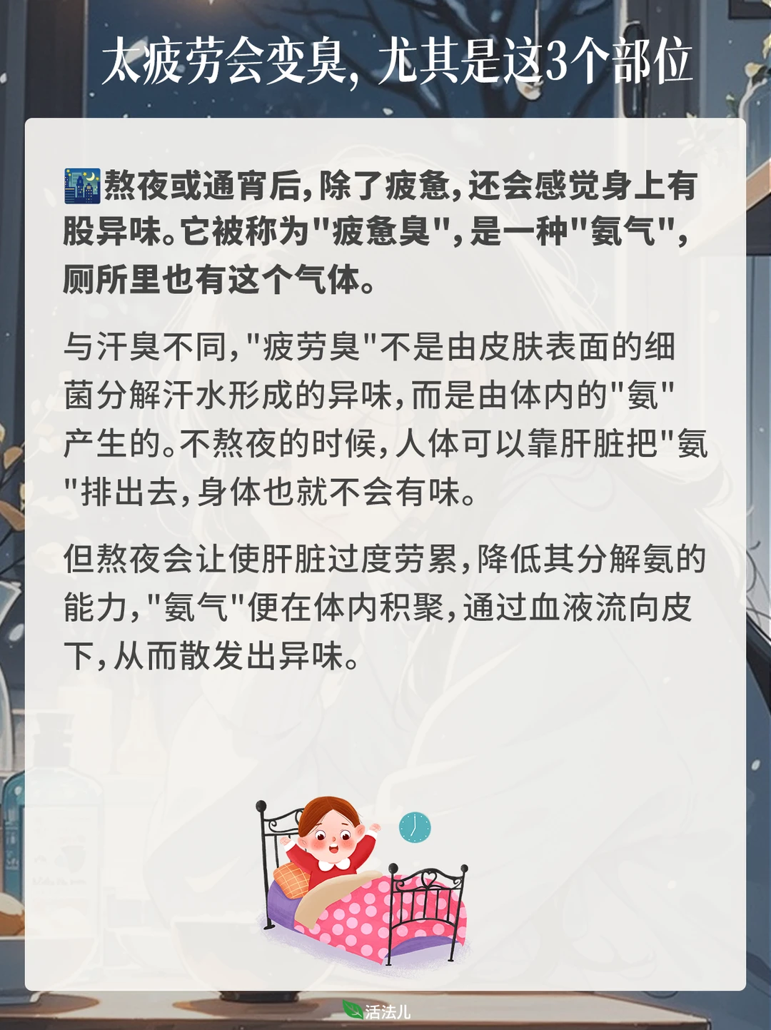 熬夜或通宵后,除了疲惫,还会感觉身上有股异味。它被称为"疲惫臭",是一种"氨气",厕所里也有这个气体。 与汗臭不同,"疲劳臭"不是由皮肤表面的细菌分解汗水形成的异味,而是由体内的"氨"产生的。不熬夜的时候,人体可以靠肝脏把"氨"排出去,身体也就不会有味。 但熬夜会让使肝脏过度劳累,降低其分解氨的能力,"氨气"便在体内积聚,通过血液流向皮下,从而散发出异味。