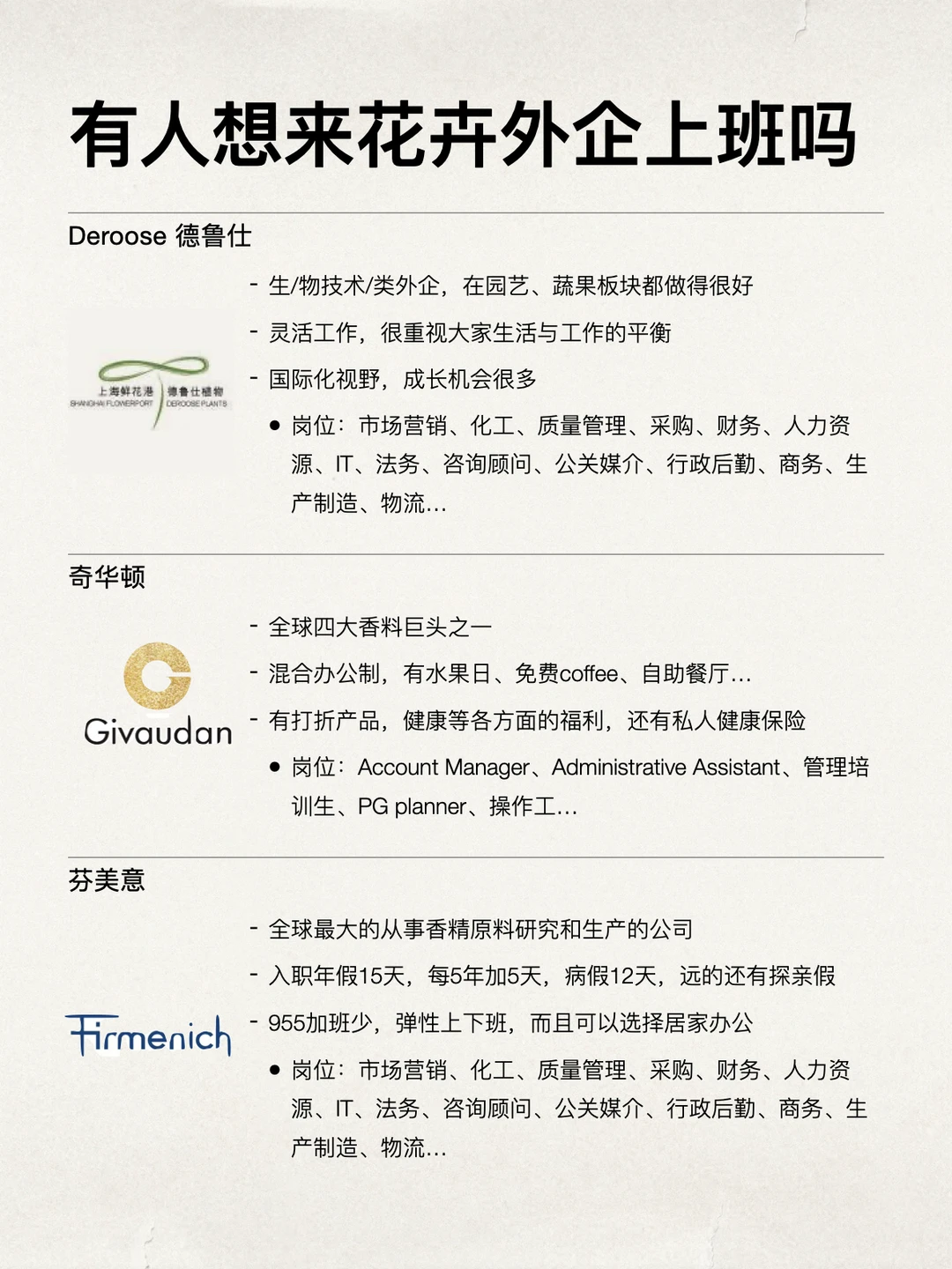 植物花卉类外企真的很适合女生,首先是这个方向很香,而且比想象中有趣。很多公司不面向大众,但业务很稳很有分量 . 像这类植物花卉相关的外企,再细分下去会发现门类很多:花卉育种、种业研发、园艺解决方案、植物科研、植物原材料、香料上游……机会也很多 . 特别适合农学、园艺、生物方向的,对女生也很友好,感兴趣的可以看看图上的详细介绍~ . 坚持日更✊🏻,对外企感兴趣的欢迎常来看看 .