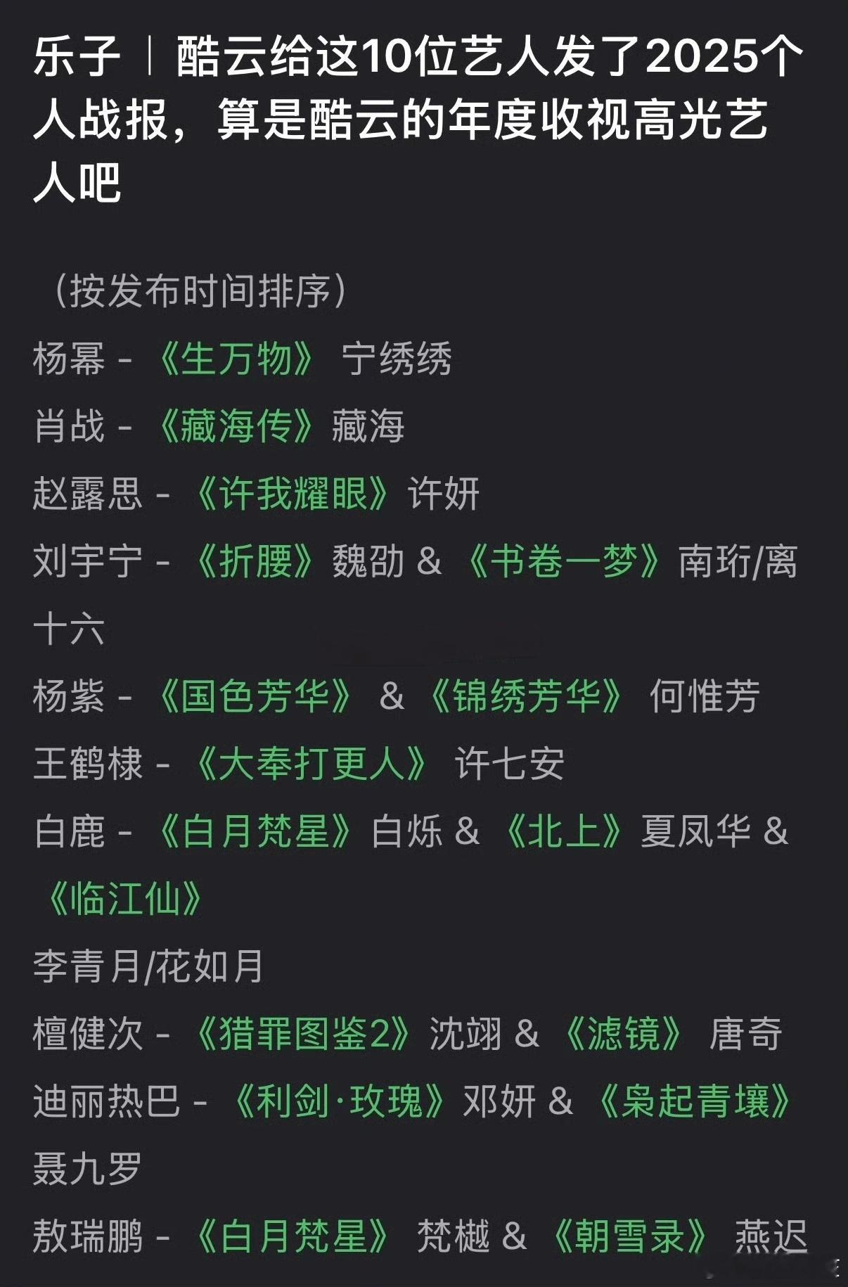 酷云原来只给10位艺人发了2025个人战报,今天播剧效果最好的10个人杨幂 肖战 赵露思 刘宇宁 杨紫 王鹤棣 白鹿 檀健次 迪丽热巴 敖瑞鹏 酷云