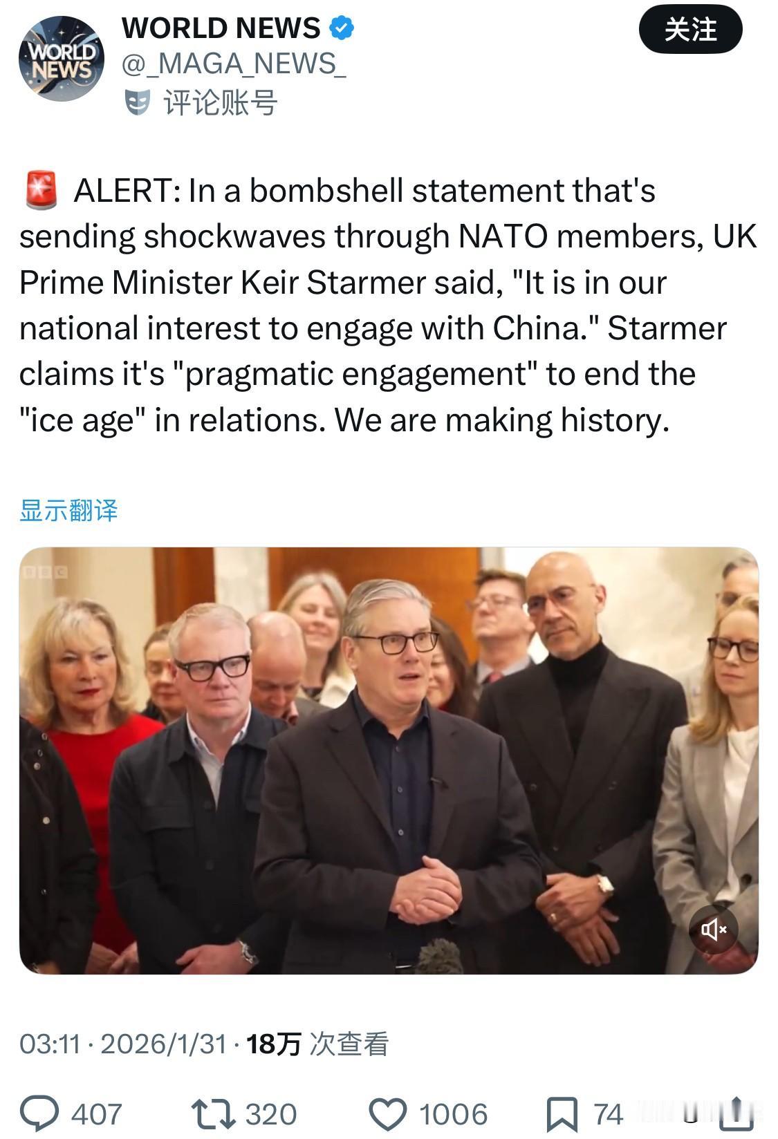 英国首相基尔·斯塔默发表了一份震惊北约成员国的重磅声明,称“与中国接触符合我们的国家利益”。斯塔默声称,这是“务实的接触”,旨在结束英中关系的“冰河时期”。我们正在创造历史。 斯塔默的立场反映了部分欧洲盟友的趋势。近期,法国、加拿大、芬兰和爱尔兰的领导人也纷纷访华,这被视为在特朗普政府政策不确定性下,中等强国寻求合作伙伴多元化的战略选择。