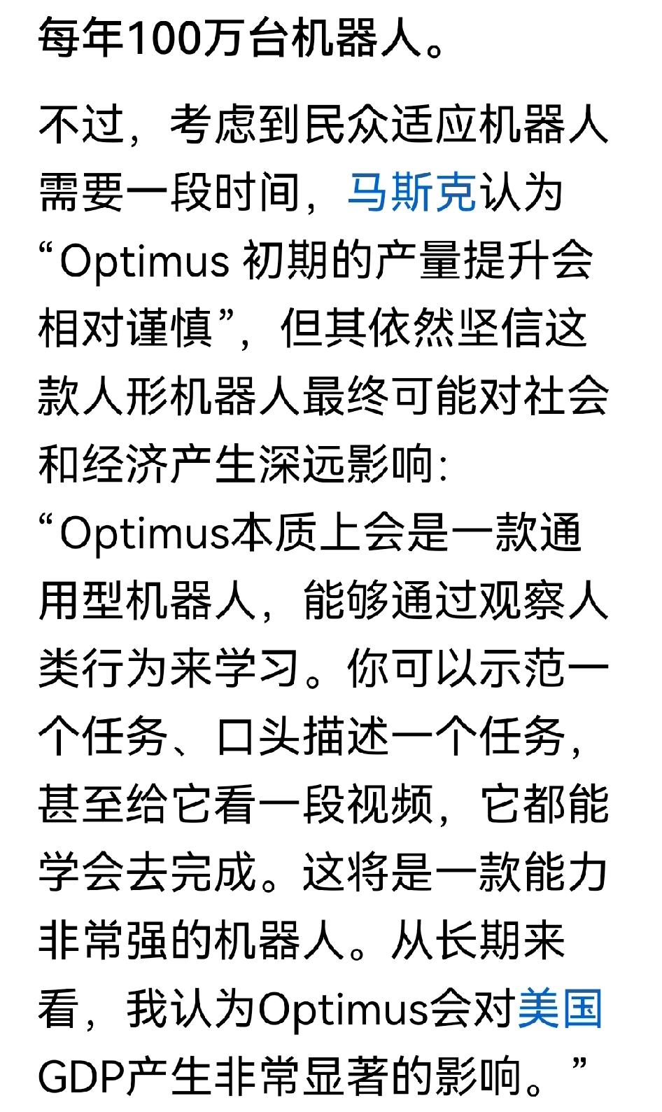 太可怕了!Optimus每年量产一百万台,那意味着什么,你知道吗?那就是战争机器,不知疲倦的战争机器,可以通过观察人类行为来学习,可以示范一个任务,口头描述一个任务,甚至给他看一个视频,他就能学习完成。这么强大的能力,如果学习了格斗技术,学习了战争问题,那么未来结局是什么?马斯克可以轻易组织起来几百万甚至几千万的队伍,这太可怕了,到了那时候,马斯克还有人可以跟他抗衡吗?越来觉得马斯克绝对不是地球人,朋友们你们同意吗?