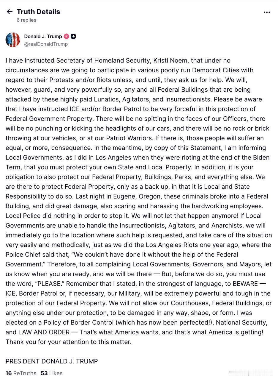新闻快讯——日期:2026年1月31日 事件:美国前总统特朗普在社交平台Truth Social发布强硬声明,就近期多地抗议活动作出回应。 特朗普已指示国土安全部长克里斯蒂·诺姆,除非民主党主政城市的当地政府主动提出请求并使用“PLEASE”一词,否则联邦政府不会介入当地的抗议或骚乱。他同时下令动用移民与海关执法局(ICE)和边境巡逻队,以“非常强硬”的手段保护联邦建筑、法院等设施,并威胁对抗议者采取“同等或更严厉”的反制措施。 这一声明的直接背景是俄勒冈州尤金市联邦大楼遭抗议者闯入并破坏的事件。特朗普还在声明中强调,保护州和地方财产是当地政府的责任,联邦仅作为后备力量介入,并以2025年洛杉矶骚乱为例,声称联邦干预是“成功的”。 目前,全美正面临“全国停摆”抗议浪潮,至少300个城市爆发反对特朗普政府移民执法政策的示威活动,多地已出现冲突升级迹象。