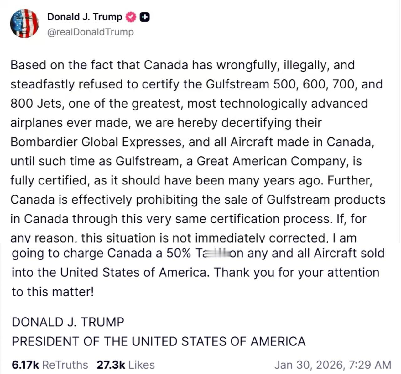 近日美国和加拿大因为飞机的事情吵起来了。 1月29日,美国总统特朗普在社交媒体上发话,指责加拿大“错误且非法地”拒绝给美国湾流公司的几款新型公务机发放安全认证。作为回应,他宣布美国将暂停所有加拿大制造飞机的认证,还威胁说,如果加方不立刻改正,就要对所有卖到美国的加拿大飞机加征50%的关税。 这个举动直接打击了加拿大的航空业巨头庞巴迪。特朗普点名要暂停认证的“环球快车”系列,正是庞巴迪用来和湾流竞争的核心产品。消息一出,庞巴迪的股价应声下跌。 加拿大为什么卡着湾流的认证?表面上是技术审查和安全标准问题,但业内普遍认为,根源在于市场保护。湾流那几款新飞机,正好和庞巴迪的旗舰机型直接竞争。而庞巴迪超过六成的销售额都依赖美国市场,加拿大方面自然想给自家企业争取更多时间和空间。 这场飞机认证之争,只是两国近期关系紧张的一个缩影。就在一周前,加拿大总理卡尼在达沃斯论坛上批评了美国的“霸权”行为,随后特朗普就撤销了其加入某个“和平委员会”的资格。更深层看,美国可能也在警惕加拿大试图减少对美经济依赖的动向,比如它正在和中国探讨更紧密的经贸合作。 如果关税威胁成真,影响会波及很广。不仅庞巴迪的飞机会在美国卖得更贵,连美国自己的航空公司也会受牵连,因为他们机队里有超过五千架加拿大制造的飞机。更矛盾的是,像庞巴迪“环球7500”这样的高端公务机,超过一半的零部件其实来自美国供应商。制裁加拿大,很可能也会伤到美国自己的企业和就业。 航空专家指出,美国联邦航空管理局通常不会因为贸易纠纷就取消已有的飞机认证,这更多是政治施压。加拿大方面目前反应克制,但已准备好了反制措施,包括可能对价值300亿加元的美国商品加征关税。 这让人想起2017年类似的一幕。当时美国应波音公司要求,对庞巴迪的C系列客机征收了巨额关税,最终迫使庞巴迪将整个项目出售给了欧洲的空客公司。如今,历史似乎又在重演。 接下来几天很关键。双方可能会在所谓的“72小时窗口期”里紧急谈判。加拿大或许会在认证程序上做出一些让步,来换取美国暂缓制裁。但无论如何,这场争端正在进一步动摇北美航空产业紧密的合作关系,并可能推高未来全球飞机制造的成本。 加拿大美国关系
