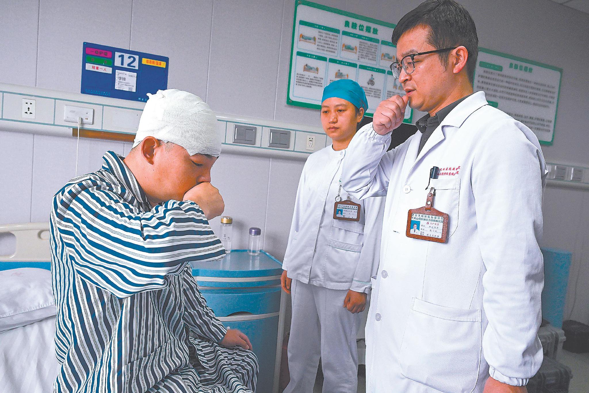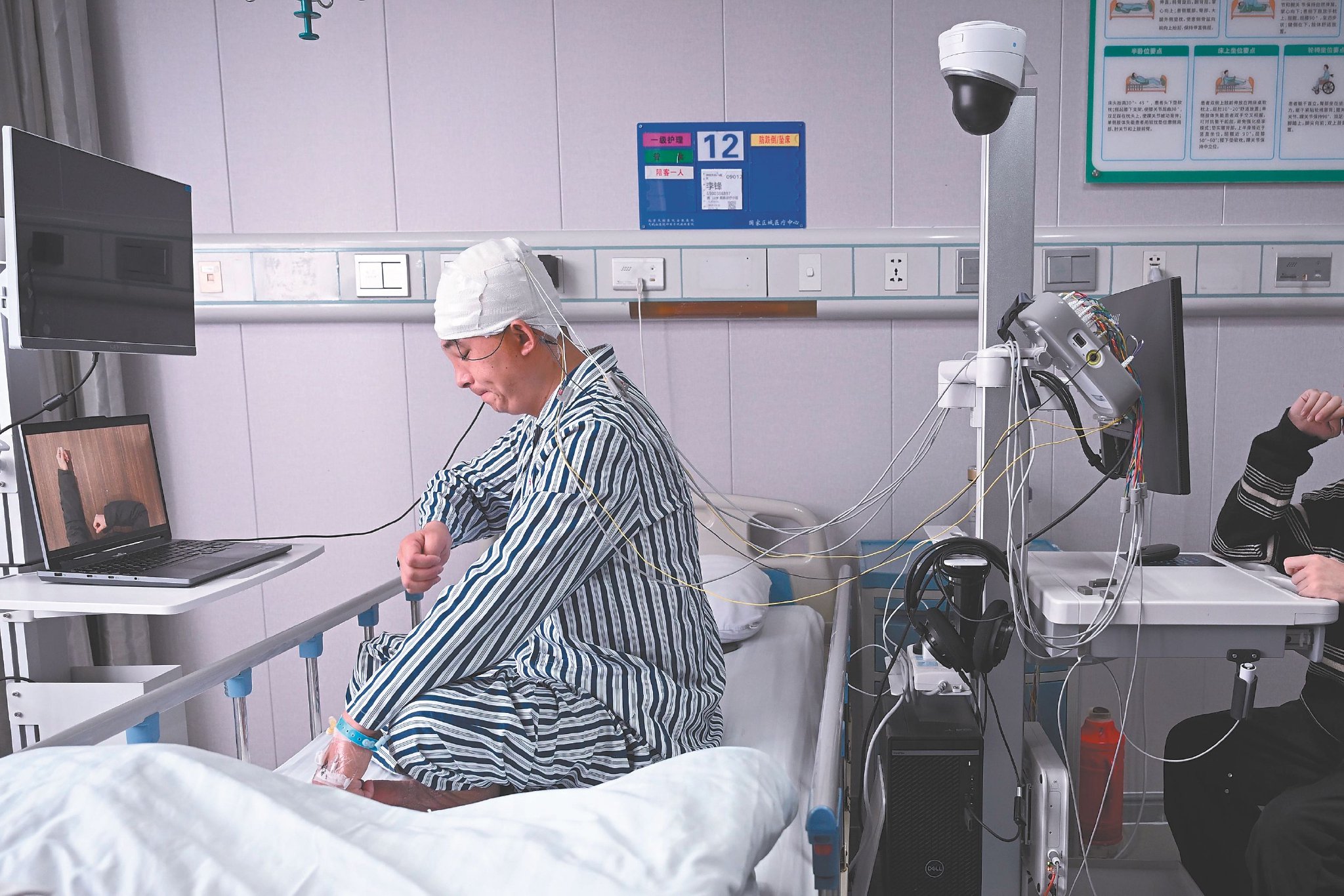 1月31日,皖南医学院第一附属医院(北京天坛医院安徽医院)工作人员为患者李某开展运动意图脑电信号采集。
