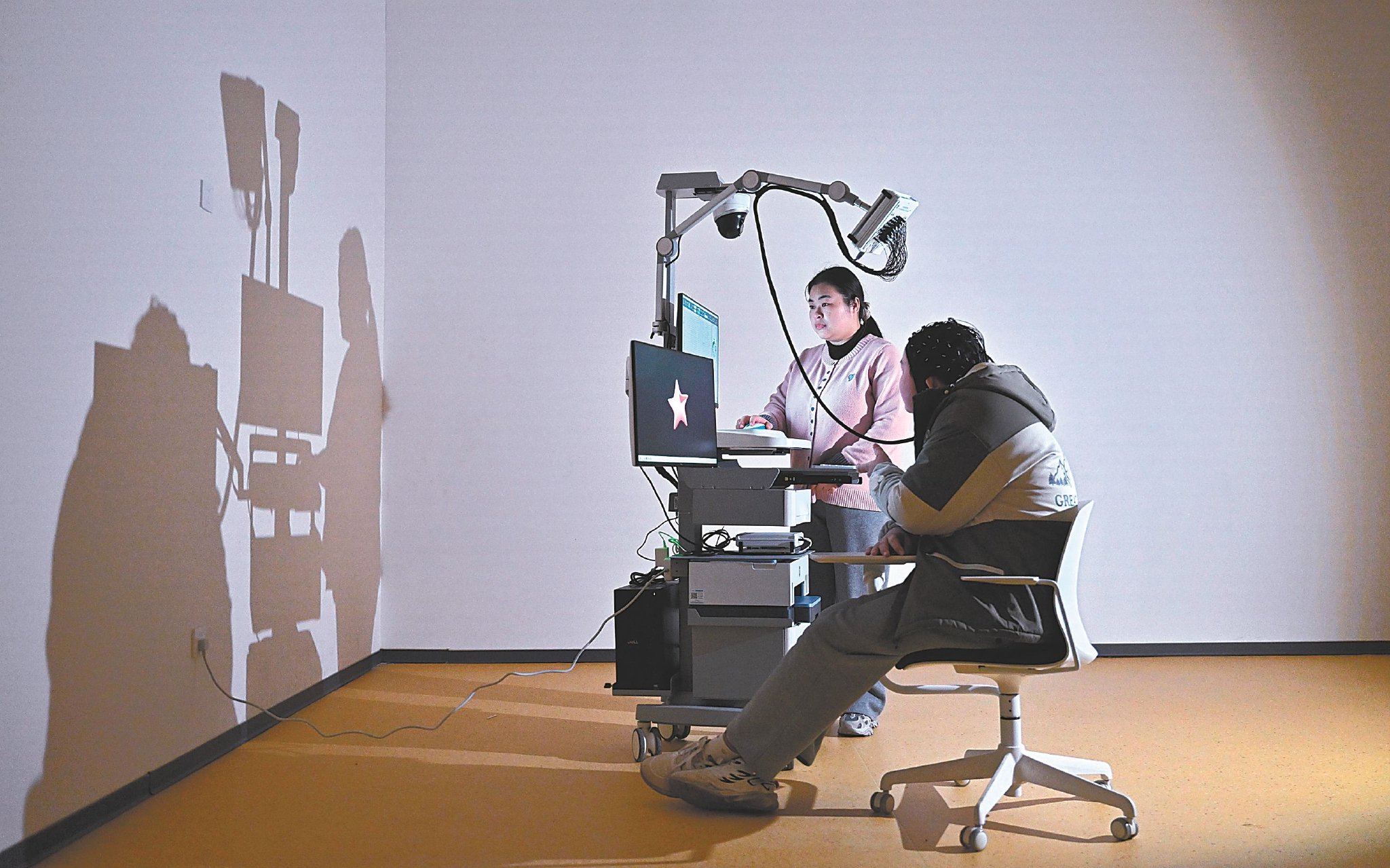 1月14日,位于肥西县的一家儿童康复机构里,工作人员使用脑电图机对孤独症儿童进行脑电信号的样本采集和社交功能的评估。