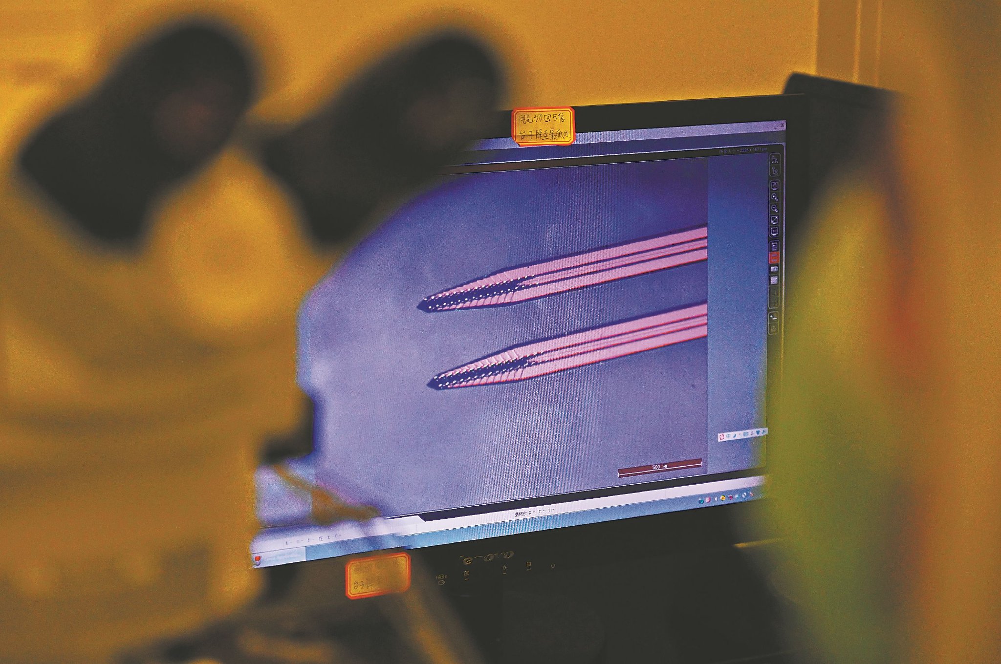 1月9日,中国科学技术大学微纳研究与制造中心,显微镜下侵入式脑机接口的神经探针。