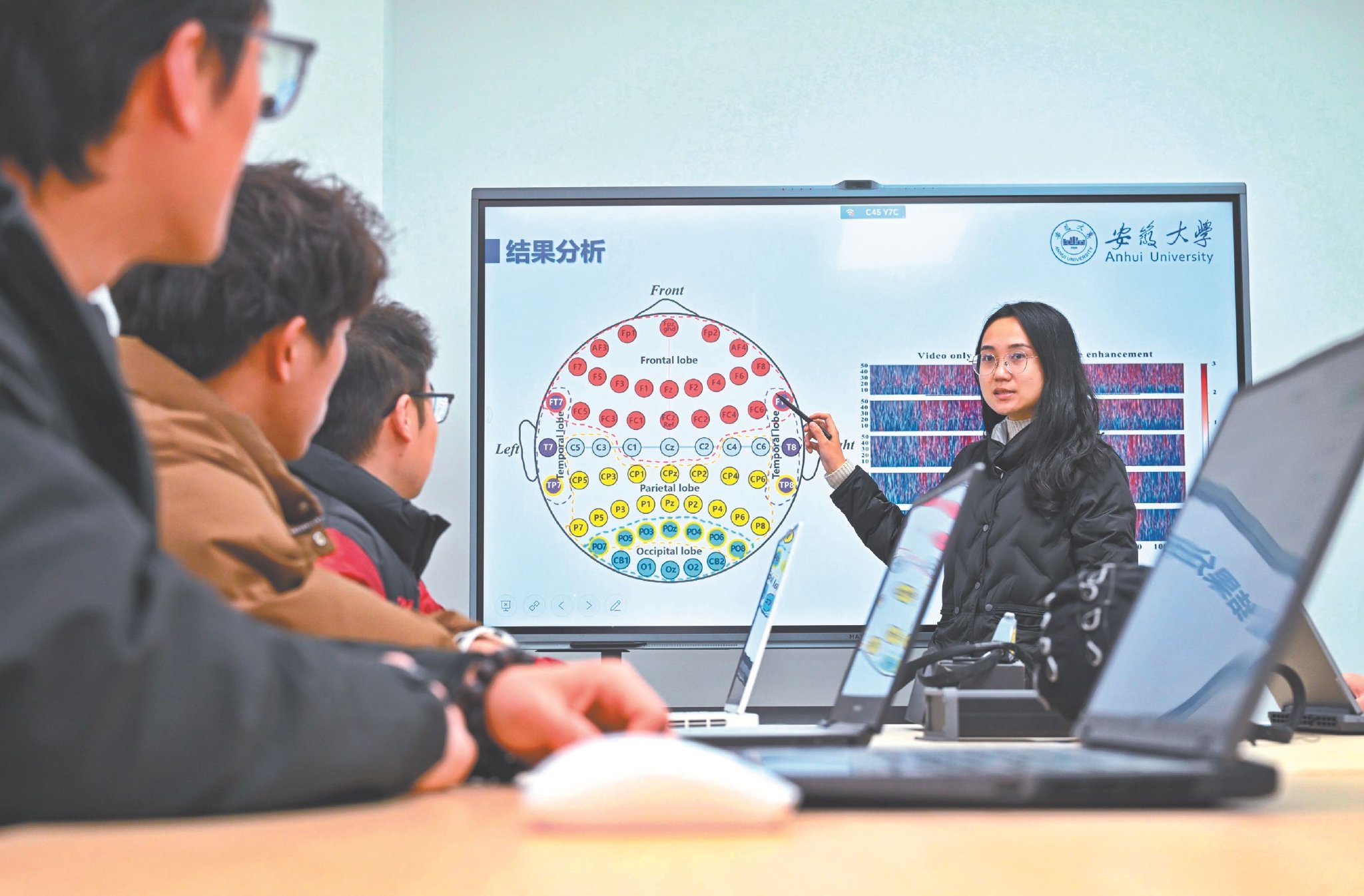 1月8日,安徽大学计算机科学与技术学院副教授李心慧和团队成员对脑电解码算法优化问题进行分析讨论。