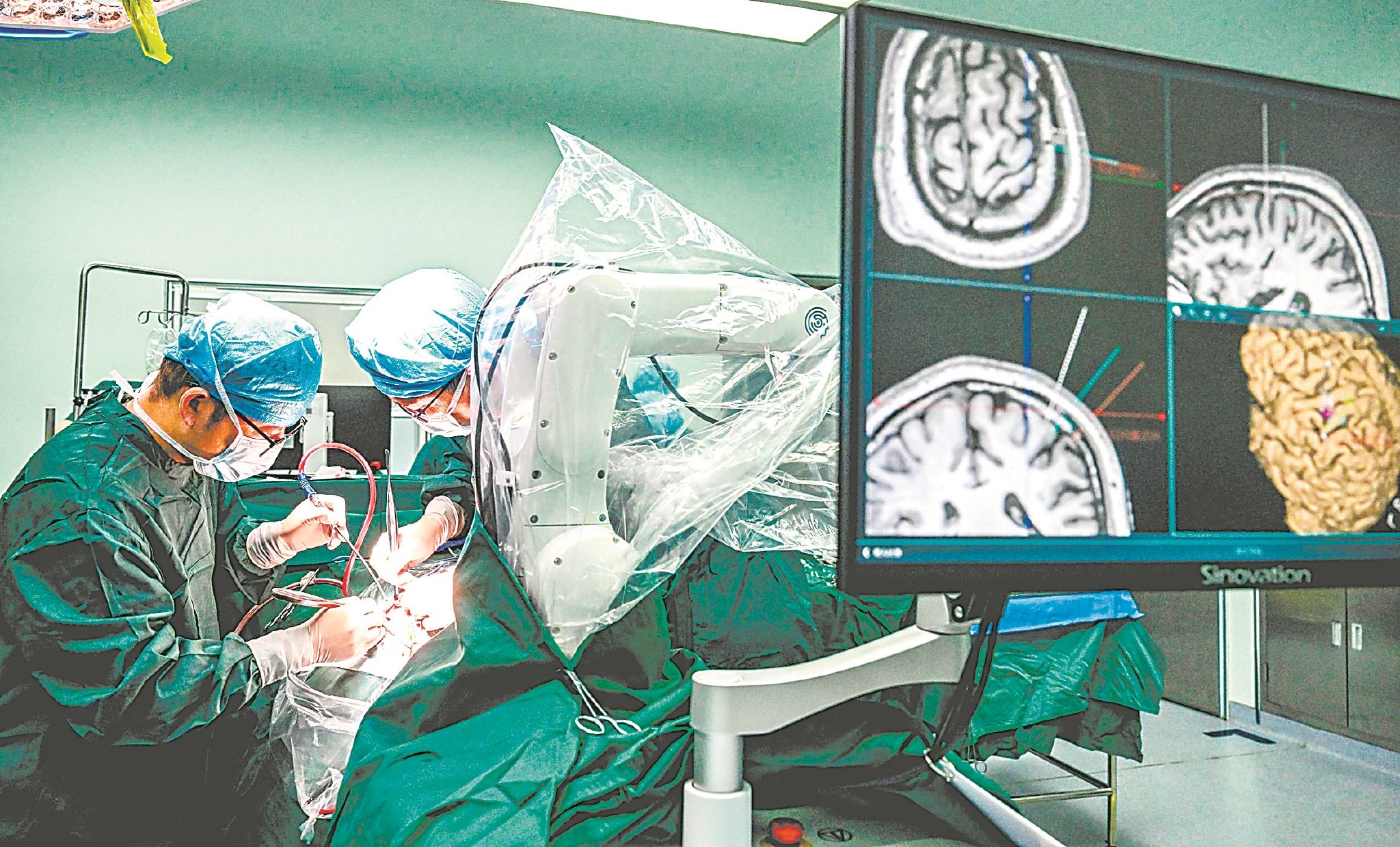 1月28日,在皖南医学院第一附属医院(北京天坛医院安徽医院)手术室,神经外科医生正在开展脑机接口手术。