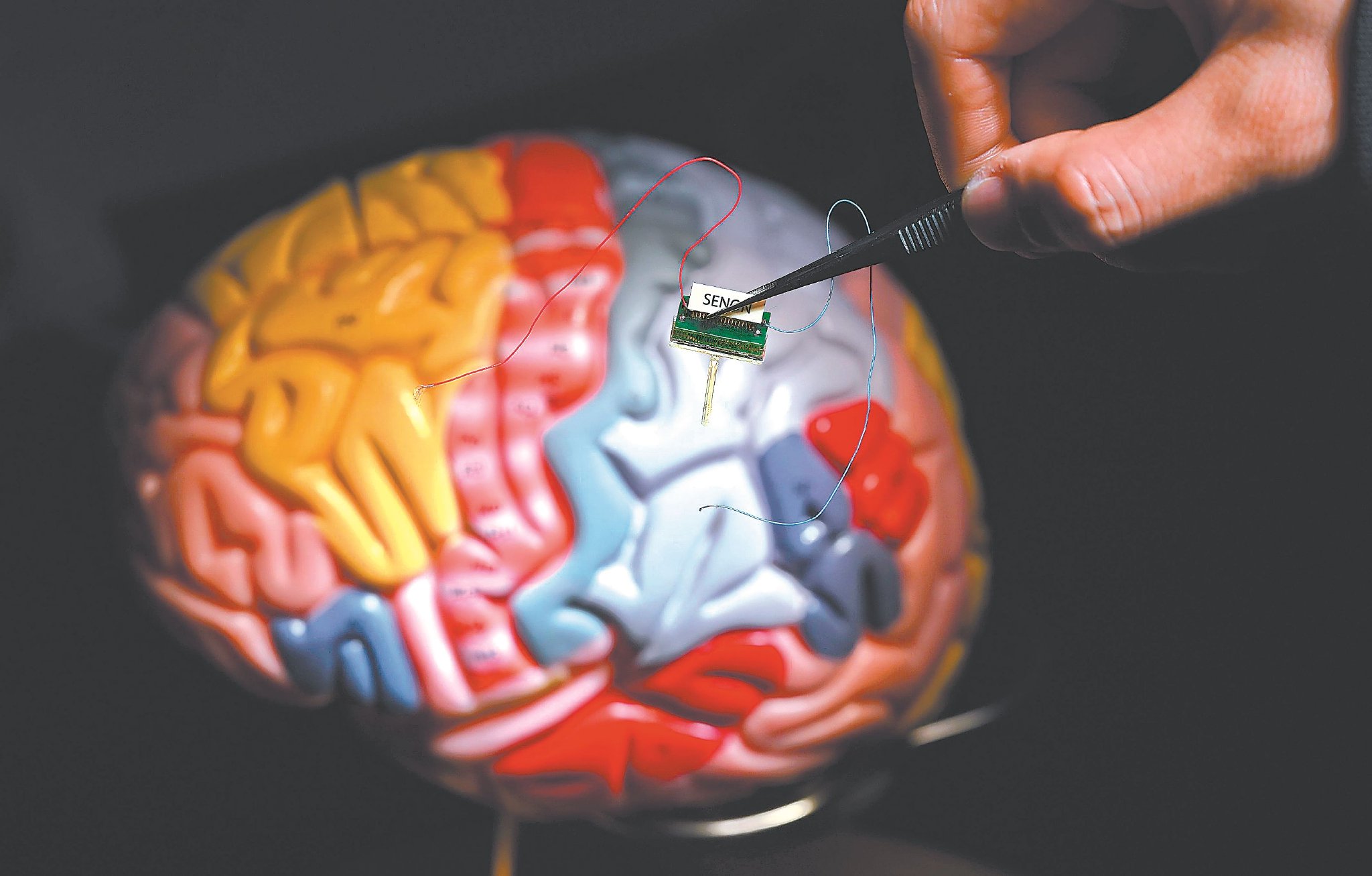 1月20日,安徽省精神卫生防治中心(合肥市第四人民医院)脑神经生物医学研究中心脑机接口技术平台,技术人员在人脑模型前展示侵入式脑机接口。