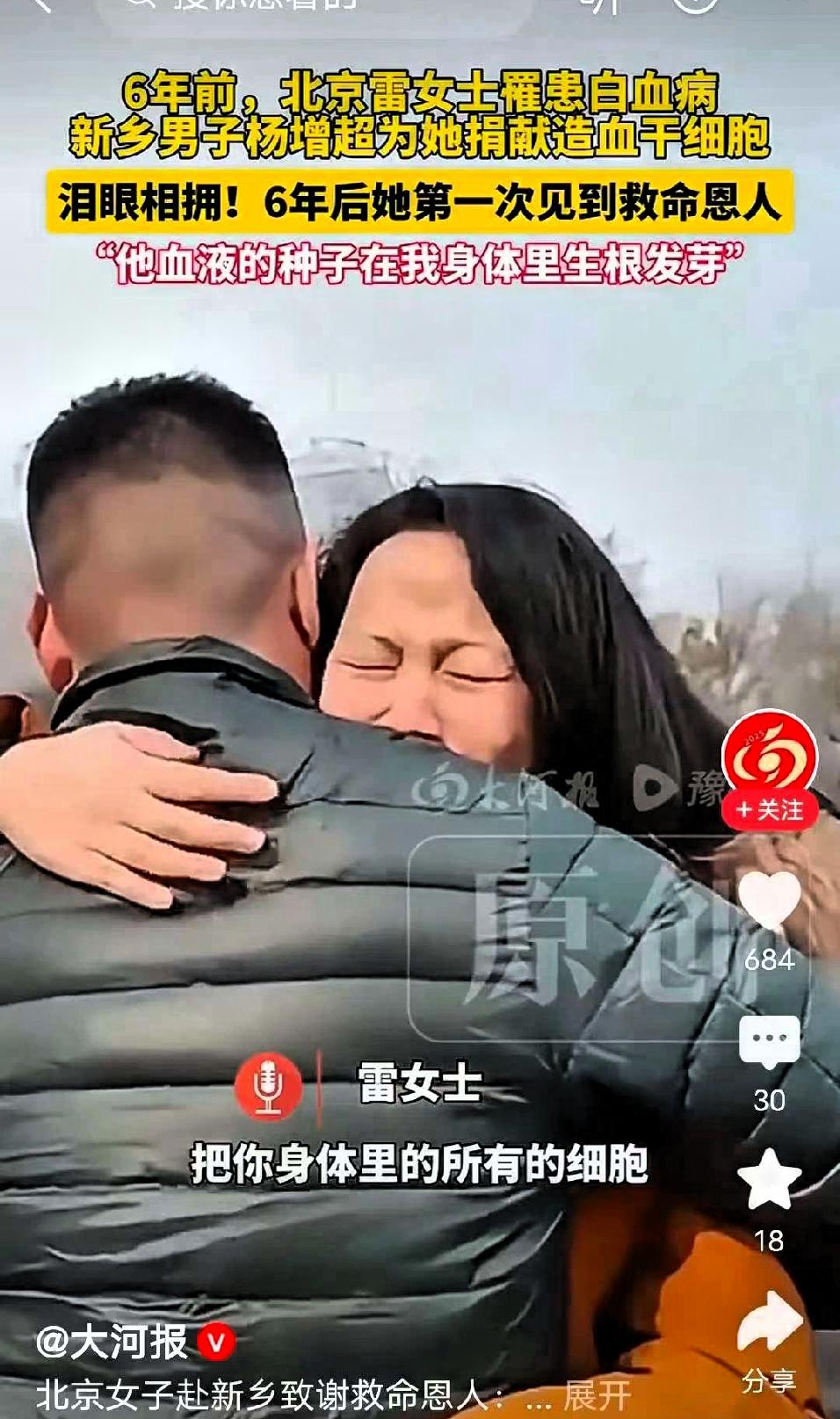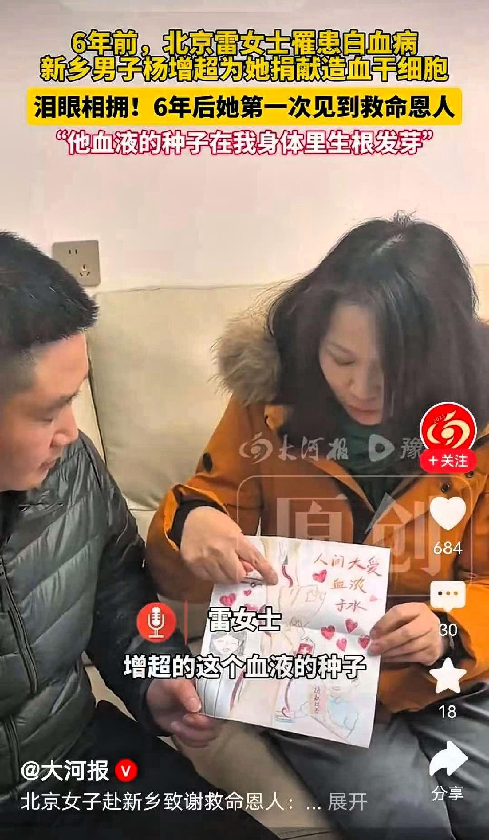 44岁的北京市民雷女士在1月31日专程奔赴河南新乡,与六年前为自己捐献造血干细胞的恩人杨增超相见 这场跨越千里的当面致谢,让平凡的善意有了最动人的模样,也让人心头满是温暖。 六年前雷女士确诊急性淋巴细胞白血病,直系亲属配型全部失败,杨增超的造血干细胞成了她唯一的生机。这份珍贵的缘分,起点只是2011年杨增超一次普通的无偿献血,那次善举让他加入中华骨髓库,谁也没想到八年后,这份偶然的善意会成为别人的生门。 要知道非血缘关系的造血干细胞配型,成功率仅在万分之一到几万分之一,这样的相遇,本就是冥冥之中的幸运。 接到配型成功的通知时,杨增超远在内蒙古工作,他没有丝毫犹豫,立马请假赶回新乡,在病床上躺了近四个小时,捐献出200毫升造血干细胞混悬液。 面对这份善举,他也只是轻描淡写一句“能救人一命,值”,简单的话语里,藏着普通人最纯粹的善良。那袋带着体温的干细胞输入雷女士体内,不仅让她成功康复,更让她的血型从B型变成了和杨增超一样的AB型,这份由善意缔结的血脉联结,让两个陌生人有了无法割舍的羁绊。 六年间,雷女士始终把这份救命恩情刻在心底,无数次在心里描摹恩人的样子。新春将至,在红十字会的帮助下,这场期盼已久的相见终于实现。她带着精心准备的礼物,还有孩子亲手画的写着“人间大爱,血浓于水”的画作,见到杨增超的那一刻,千言万语都化作哽咽的感谢,双手相握,泪眼相拥,两个原本陌生的人,因一场捐献成了血脉相连的亲人。 其实善意从来都不是什么惊天动地的大事,一次骨髓库的登记,一次义无反顾的捐献,就能为绝境中的人带去希望;一份念念不忘的铭记,一次跨越千里的回应,就是对善意最珍贵的回馈。杨增超的付出与雷女士的感恩,构成了世间最美好的双向奔赴,也让我们看到,平凡人的善意,足以温暖整个世间。