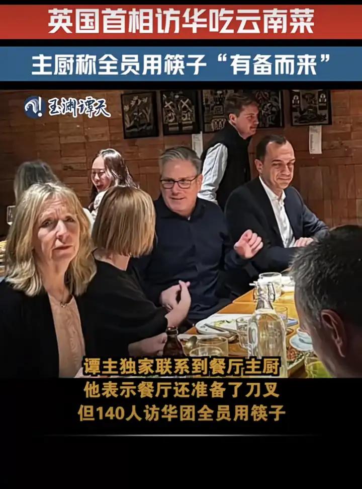 英国首相斯塔默在访华的头一天,就在北京的一家云南菜馆用餐。让人意外的是,140人的访华团全员用筷子,没让上刀叉,之所以如此首先就是礼仪问题,吃中餐用筷子在英国本土是必须的。基本礼仪。 在英国,尤其是在英国的高级亚洲餐厅,筷子是餐具标配,用餐礼仪一部分,精英阶层家庭从小会用筷子是基本技能。而且很多西餐厅也有筷子,你跟服务员要一般都有。 当晚英国首相斯塔默带着 140 人的团队包场就餐,从20点吃到22点,一口气尝了13道云南特色菜、3 道甜品还有4种饮品,整桌菜把云南各地的风味吃了个遍。实际上这几年欧洲政要访华,都素云南菜的 “忠实粉丝”,菌子更是他们的餐桌必点。 实际上早在 1986 年,英国女王伊丽莎白二世访问昆明时,就对云南的虎掌菌、鸡枞菌爱不释口,还被火夹乳饼的味道惊艳到,就连云南滇红茶都成了她的珍藏,但总体招待斯塔默的伙食标准太低了,人均消费才108。 2026开年还不满一月,中国就连续接待外国元首。韩国总统李在明,爱尔兰总理马丁。加拿大总理卡尼,芬兰总理奥尔波访华,而压轴的是英国首相斯塔默。而在春节结束后的大年初八,德国总理也要来。 这些国家来中国访问,很多程度上就是要发泄对特朗普政府的不满,开始访华说明美国对这几个国家的欺负也让他们快受不了了,这些国家首脑来中国就是为了制约美国,终于知道来找中国来加强联系对抗特朗普,而此举显然激怒了美国政府,特朗普在拿大总理卡尼访华后,对卡尼表达了强烈不满,这也侧面说明卡尼来对了。 当然也有表演的意思,就是给美国爸爸看,别这样对我们了,在这样对我们我们就去投靠中国了,中国看的明白,美国也看的明白。 但是也有要谨慎地一面,那就是咱们也要保持清醒,因为西方世界内部有着复杂的关系,说白了是跟咱们示好了,咱们也欢迎,但是国际格局很难在短期内发生根本改变,更不是一蹴求救,一旦美国对他们稍微释放一点利益,他们立即就会背信弃义,因此我们咱需要的是做好自己的事,让自己更强大这才是真正的底气。国际时事 我是清水空流,历史的守望者。期待你的关注和点评。