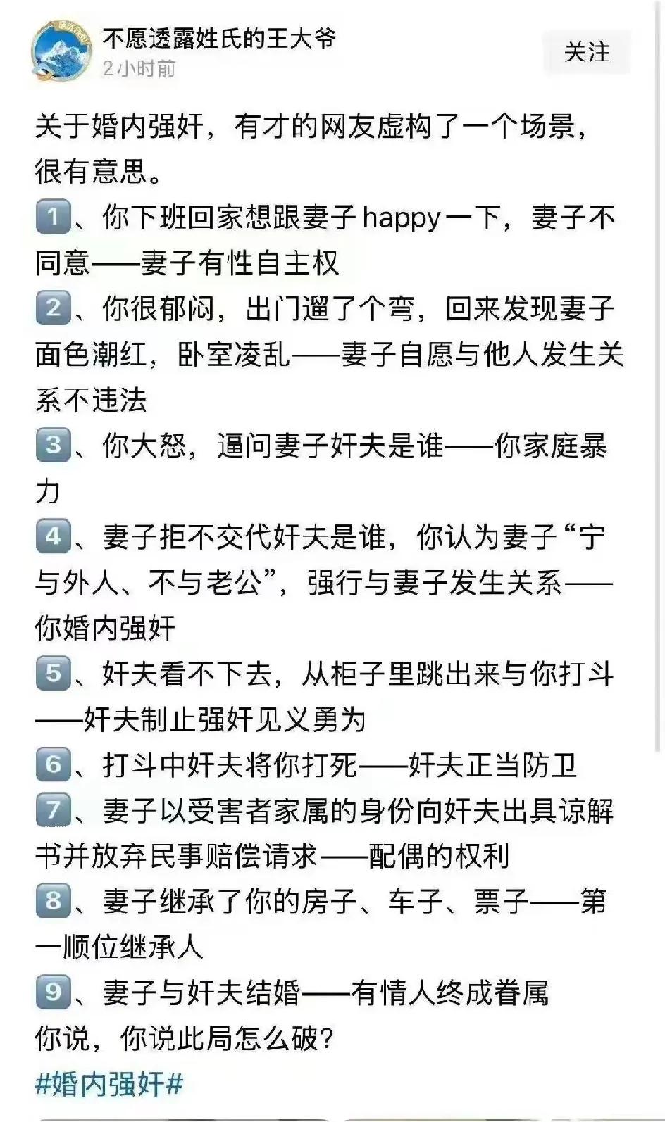 看到网友编的这个段子,用来驳斥罗翔等人所推崇的西方法律体系,看完以后我有几句话要说。 虽然整个段子看上去形成了逻辑闭环,但是根本经不起仔细推敲,而且这样的事情在现实生活中基本上不会发生,就算发生了也只是极其罕见的个例,根本不具有普遍性和代表性。试图用这样的段子来推翻罗翔他们所推崇的西方法律体系,我认为根本站不住脚。 我也是个男人,我完全赞成女性就算已经结婚,也应该有性自主权的观点,不然只要男的想做,女的无论生理和心理有什么不适都要配合吗?丈夫用强迫的手段强行发生性关系,给女性带来身体和心理上的伤害也无所谓吗?法律讲的是以人为本,男人是人,女人同样也是人!