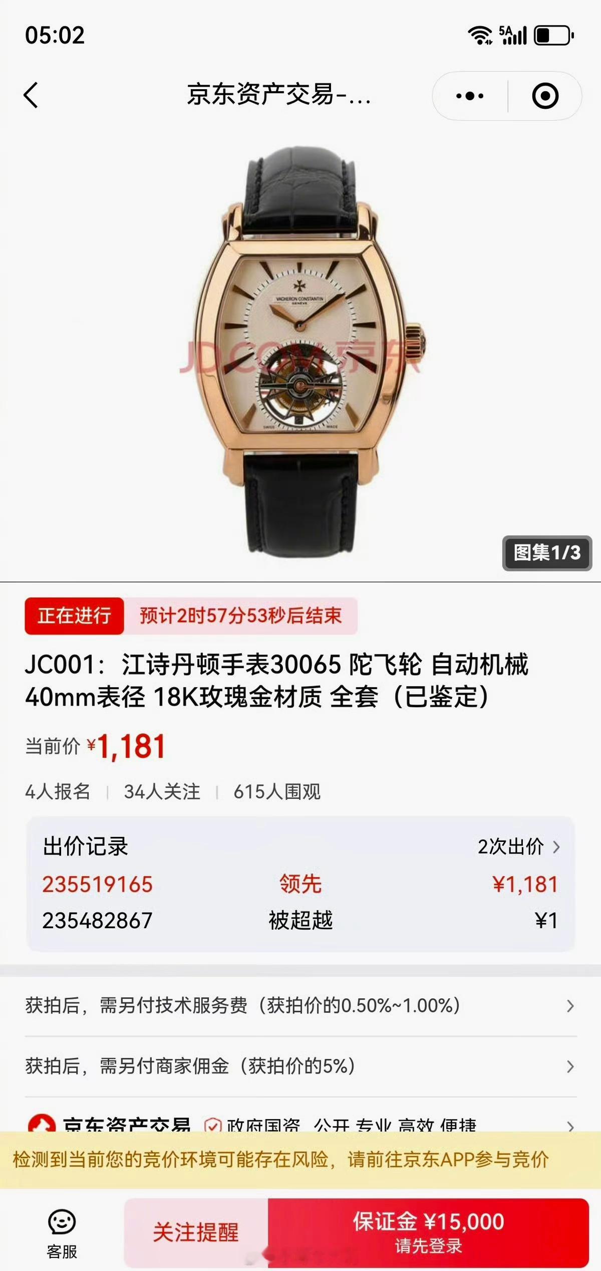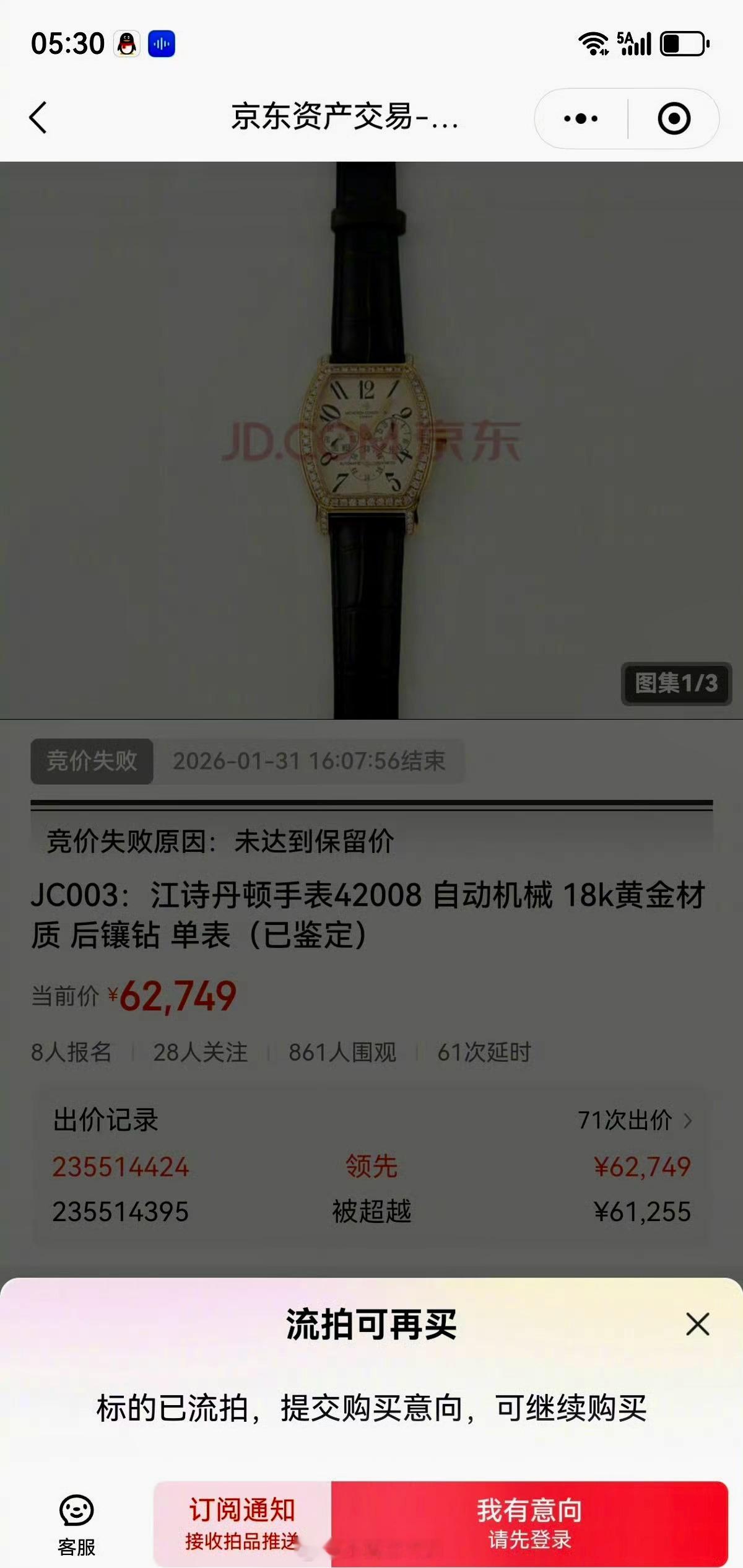 江诗丹顿手表在京东拍卖以1元起拍,其中42008型(18K黄金、后镶钻)吸引8人竞拍,71次出价后达6.27万元,仍因未达保密保留价而流拍,另一只30065型陀飞轮表仅出价至1181元。拍卖公司回应:系官方罚没真品,“1元起拍”仅为引流,实际成交需超过处置方设定的保留价。流拍后仍可提交购买意向。江诗丹顿两只手表1元起网拍