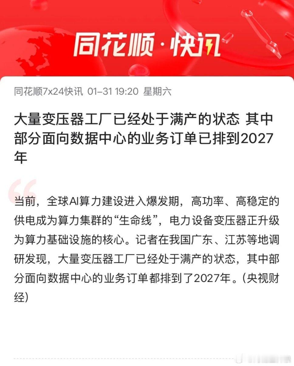 变压器:满产状态下订单排到2027年!特变电工 (600089):净利润 +27.55% (54.84亿),动态市盈率约 12.5保变电气 (600550):净利润 +72.91% (1.46亿),动态市盈率约 45.2中国西电 (601179):净利润 +19.29% (9.39亿),动态市盈率约 35.8江苏华辰 (603097):业绩高增,动态市盈率约 25.6金盘科技 (688676):净利润 +20.27% (4.86亿),动态市盈率约 22.4思源电气 (002028):净利润 +46.94% (21.91亿),动态市盈率约 20.1三变科技 (002112):净利润 -48.84% (0.40亿),动态市盈率约 38.5华明装备 (002270):业绩高增,动态市盈率约 24.9伊戈尔 (002922):业绩高增,动态市盈率约 28.3晟辉科技 (301090):业绩高增,动态市盈率约 40.1扬电科技 (301012):业绩高增,动态市盈率约 50.2明阳电气 (301291):业绩高增,动态市盈率约 18.7