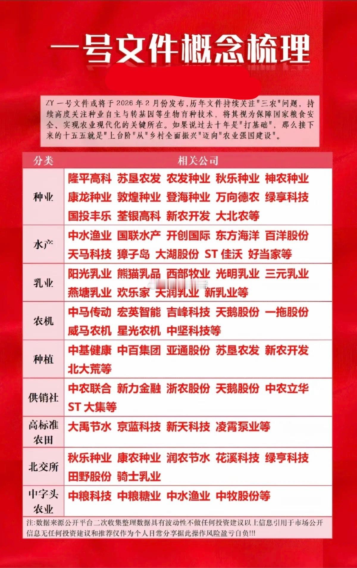 农业一号文件即将于2月出台。相关种业,种植,农机设备、乳业、水产养殖等提前潜伏。相关核心龙头股: