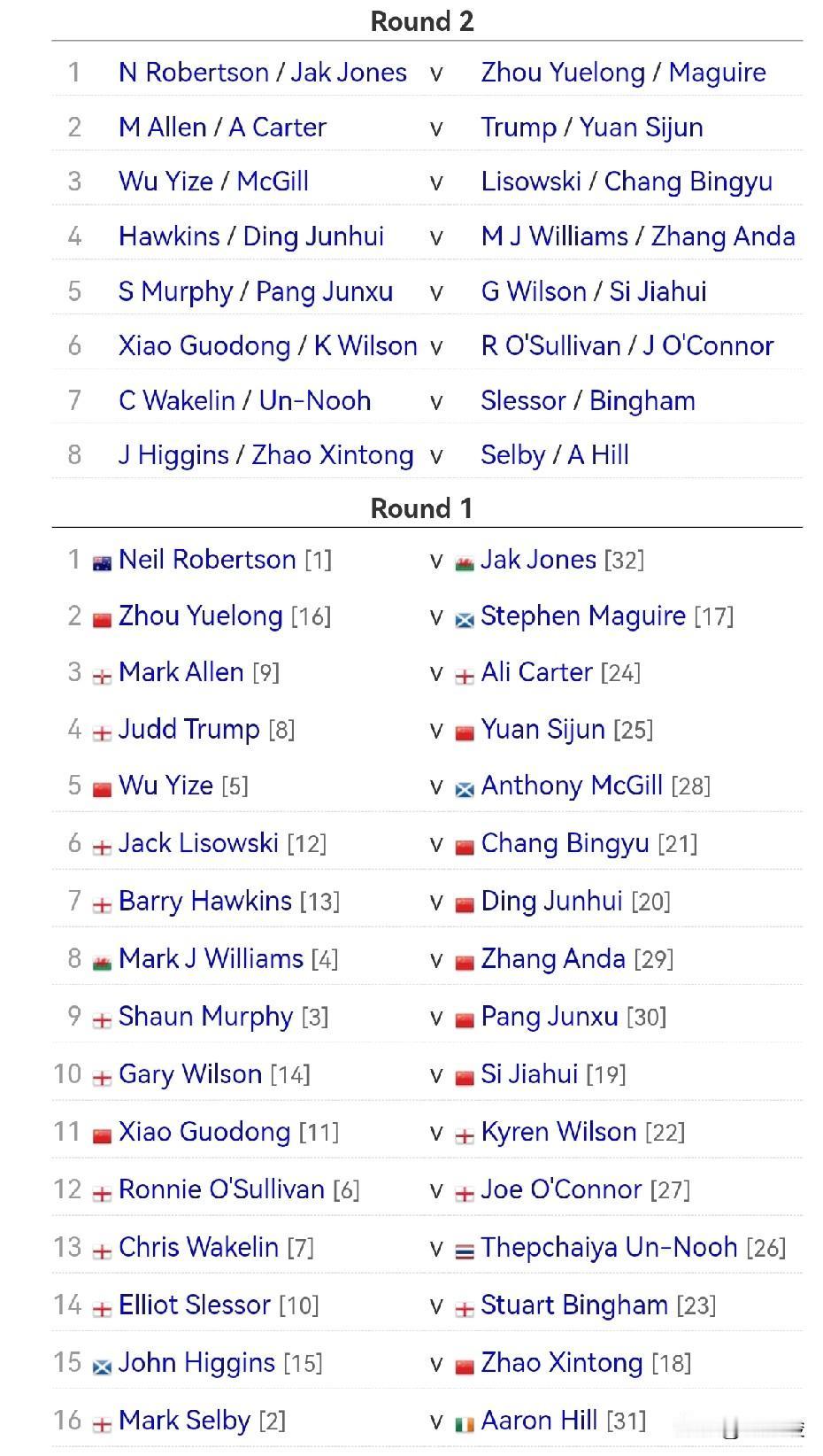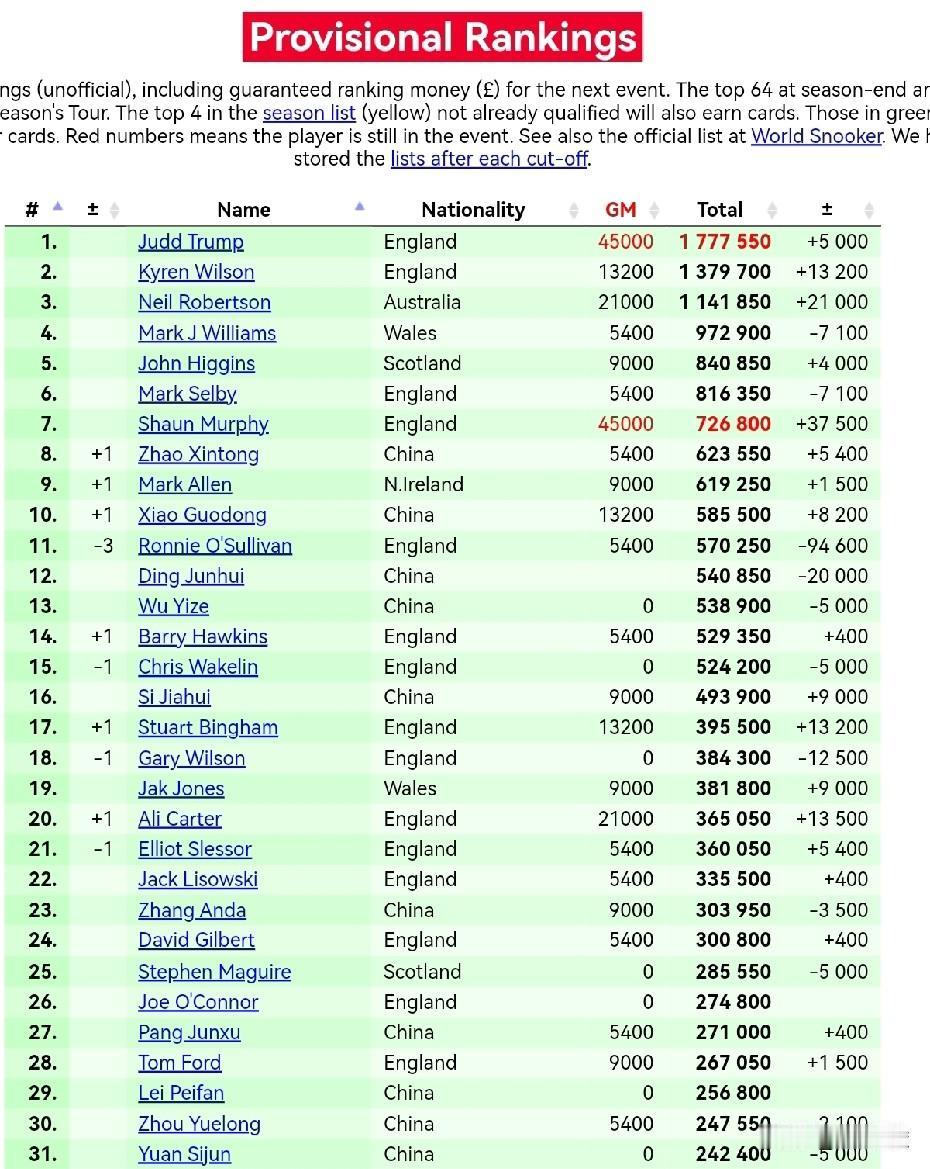 德国大师赛只剩今天的决赛,如果特鲁姆普夺冠,则会巩固其世界第一的排名,如果墨菲夺冠,其排名依然第7。斯佳辉目前第16的排名暂时稳固,火箭因扣积分临时排名已经跌至第11。 斯佳辉目前排名第16,积分比排名上升到第17的二师兄宾汉姆多10万英镑左右,由于斯佳辉上上赛季世界大奖赛没有入围32强,因此不需要扣积分,而本赛季宾汉姆和斯佳辉都入围了世界大奖赛。分析了一下排名,除非排名第17到第22的选手在世界大奖赛中夺冠,否则斯佳辉的前16位置相对稳固。 火箭奥沙利文由于上上赛季世界大奖赛决赛10-7战胜特鲁姆普夺冠,因此要扣10万英镑积分,目前排名跌至第11。火箭入围今年的世界大奖赛,首轮对阵奥康纳。 以下是前16球员的临时排名: 1.特鲁姆普 2.凯伦·威尔逊 3.尼尔·罗伯逊 4.马克·威廉姆斯 5.希金斯 6.塞尔比 7.墨菲 8.赵心童 9.艾伦 10.肖国栋 11.罗尼·奥沙利文 12.丁俊晖 13.吴宜泽 14.霍金斯 15.韦克林 16.斯佳辉。 临时排名前16的球员中,中国的赵心童和肖国栋各上升1位。 按照规则,世界大奖赛后将决出本赛季球员锦标赛16名球员名单。 图二为临时排名榜单(部分),图三为即将在中国香港进行的世界大奖赛第一轮对阵。 中国球员,加油!