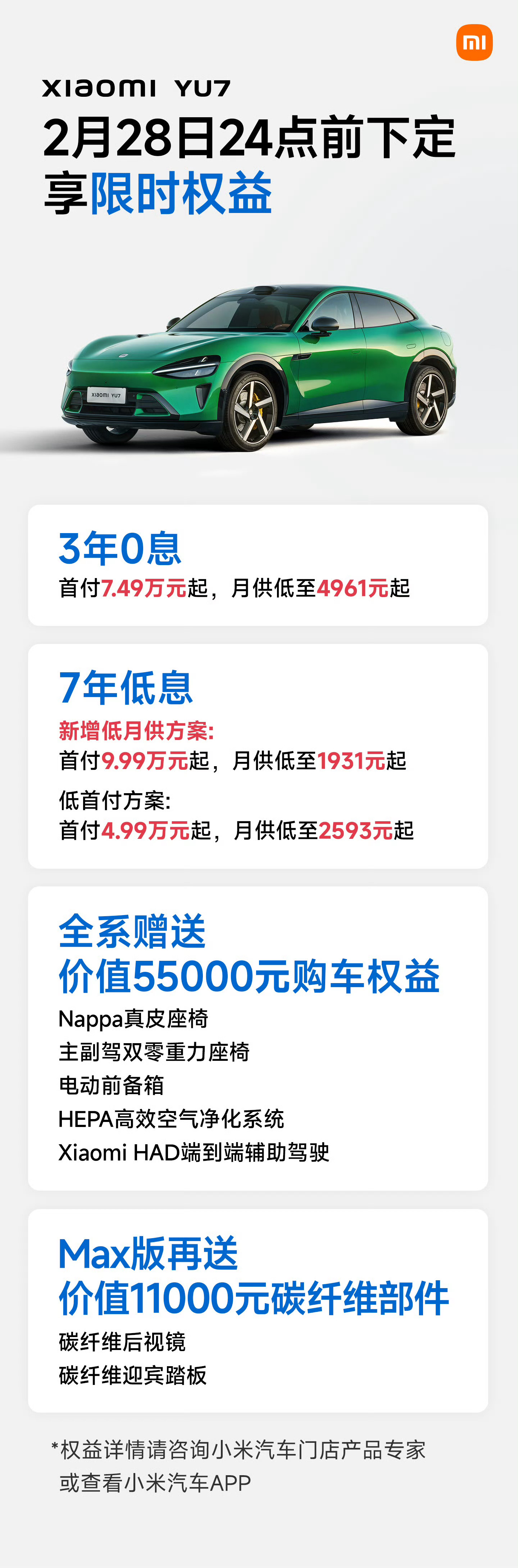 小米YU7 新的“7年低息”方案:首付9.99万元起,月供低至1931元。