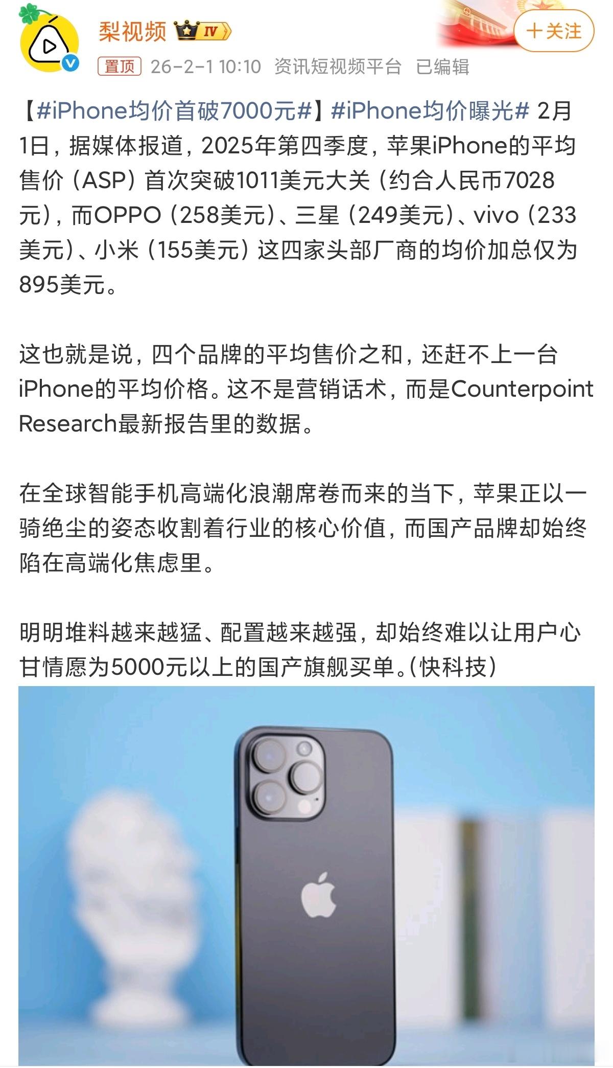 iPhone均价曝光这么一对比安卓阵营真的得加油啊,虽然安卓厂商销量大,但是均价太低,ov米加三星可是全球前五的品牌,均价加一起都比不过果子,说到底产品没利润,纯铺量,而果子真的离谱,手机卖得又贵又好,据说iPhone17系列国内销量已经快2000万了,单价最高的17PM占比最高,果子可真的是赚得盆满钵满。
