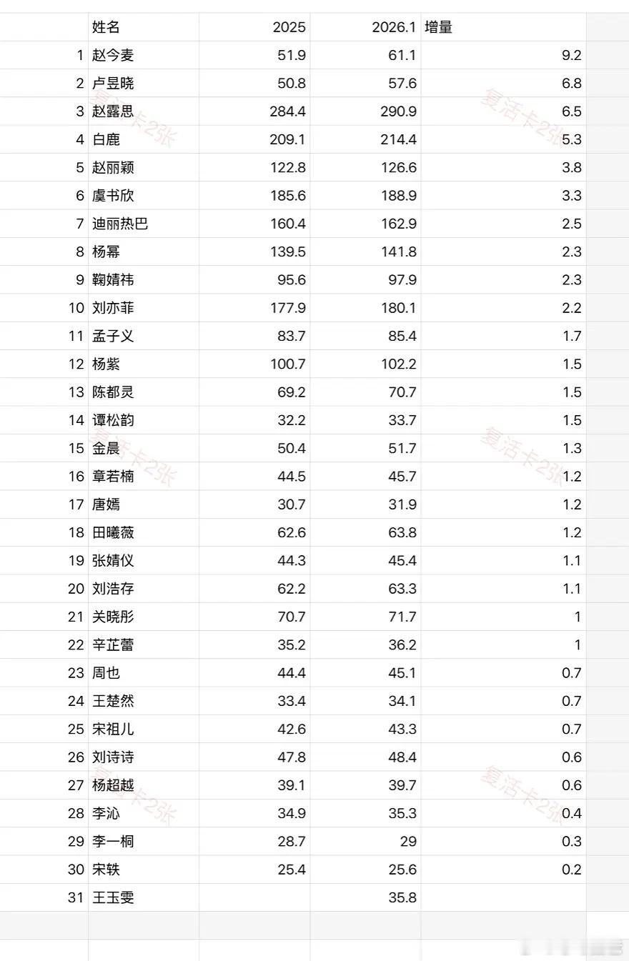 小红薯🍠女明星话题一月增量及总量排名赵今麦骄阳似我有效播剧增量第一赵露思靠着去年许我耀眼杀回宫总量依旧断层🔝