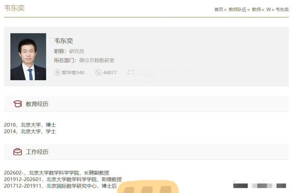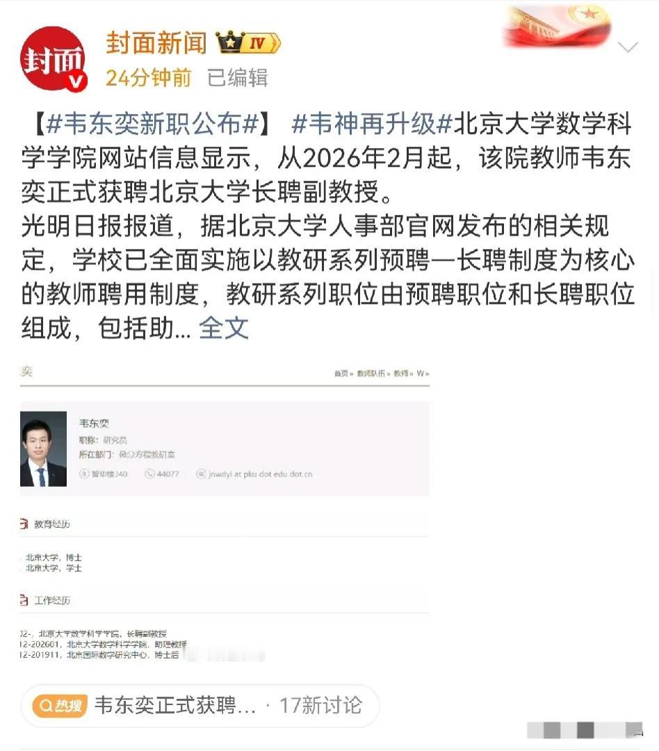 韦神,官宣了! 2月1日,学术圈传来大好消息,北大数学科学学院,官宣一个重磅消息——韦东奕正式升级为长聘副教授,直接拿下“铁饭碗”+正高级待遇buff,这晋升速度简直是学术圈“火箭级”! 可能有人不懂这头衔含金量,北大长聘制可是出了名的严格,要签无固定期限合同,福利直接对标正高级,相当于学术圈的“终身保障”。 更牛的是,韦神从2019年博士后出站任助理教授,短短六年就直通长聘,还顺带拿下双认证,同时拥有研究员学术头衔。 他的晋升全靠硬实力支撑,2025年一年就发表32篇高质量论文,其中7篇登上《Forum of Mathematics, Pi》等国际顶刊,单篇核心成果被引超300次,还和合作者解决了陶哲轩等人提出的十年之久的数学猜想。 北大长聘评审向来看重同行认可,韦东奕不仅获文兰、王诗宬两位中科院院士联名提名参评北京市杰出青年奖,其研究成果还被写入北大研究生教材,相关技术应用于航空发动机设计,让仿真数据与实测吻合度达99.8%。 常规理工科教师从预聘到长聘平均需要6-8年,人文社科更是长达8-10年,韦东奕6年达标,且研究聚焦基础数学这一“慢产出”领域,打破了学术评价中“唯短期成果”的惯性。 学术圈的核心竞争力终究是实打实的成果与贡献。韦东奕的快速晋升,印证了顶尖学府对纯粹学术能力的尊重,也为专注基础研究的学者提供了范本,这种不重虚名、只看实力的评价导向,正是学术创新最需要的土壤。