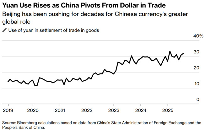 彭博社的数据显示,使用人民币的国际贸易结算率,从2019年的大约12%上升到2024–2025年的大约30%。但是,来自Swift系统的统计数据并不准确。因为,有许多跨境贸易在使用人民币结算时,已经不用Swift系统了,所以无法完整统计。