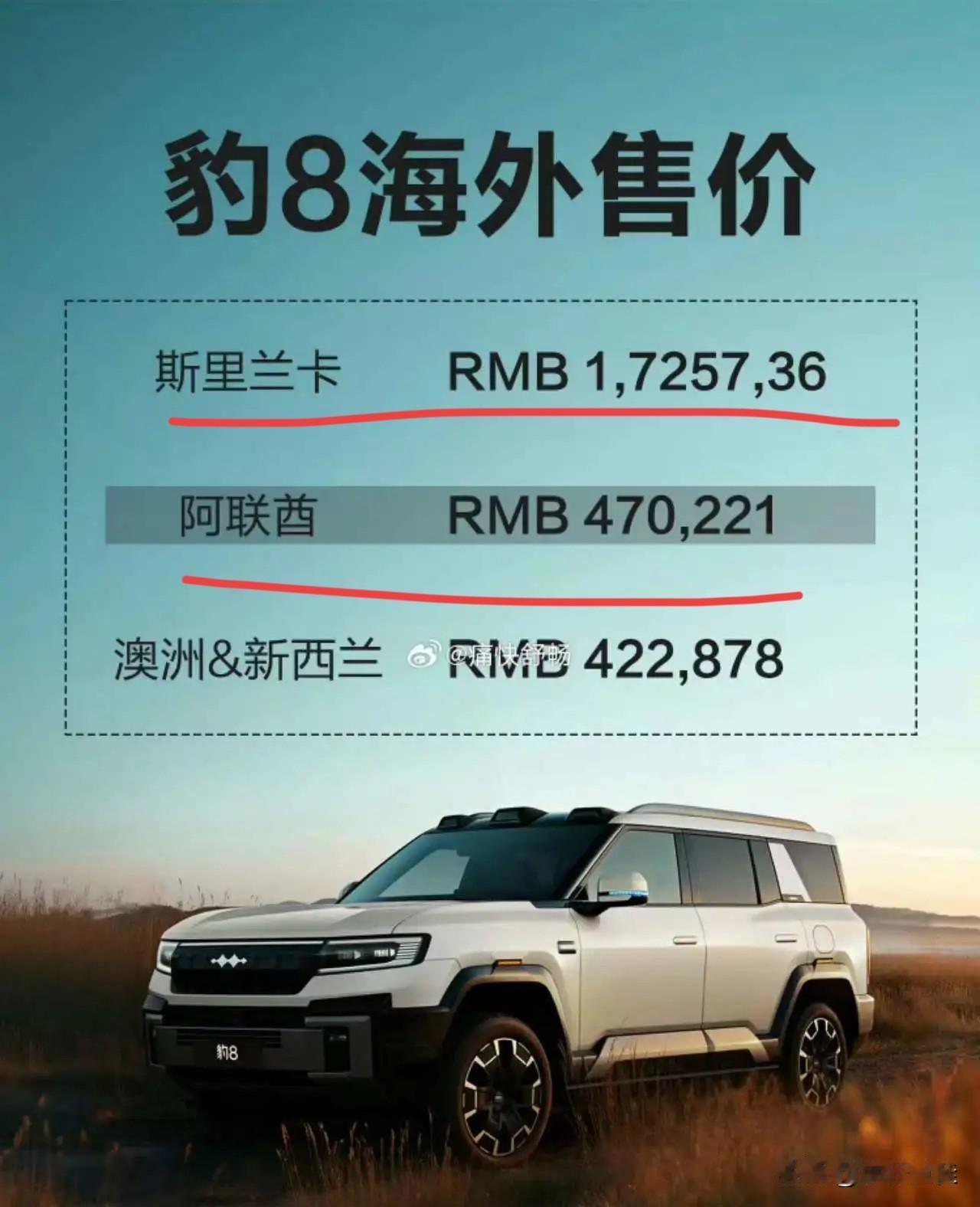 比亚迪这是把外国人往“死里”薅啊! 看看方程豹豹5跟方程豹豹8的海外售价,方程豹豹5斯里兰卡售价112.8万元人民币,方程豹豹8斯里兰卡售价172.57万人民币,除了斯卡兰外,其他地区也要比国内贵大几万,但有一点我想不通,阿联酋这售价是看不起谁呢?大户门缺你这点?直接百万起步得了![呲牙]