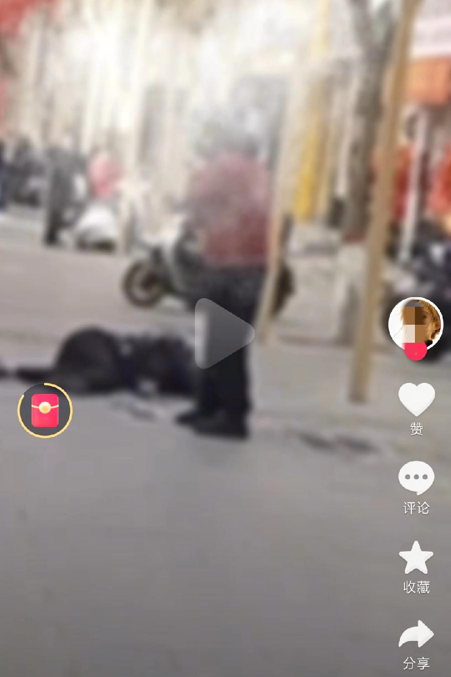 小区微信群吵架行凶现场,路人拍摄视角,在门面店门口的大马路边上,全身黑衣服男子侧躺在地上,行凶者穿红色上衣,黑裤子黑鞋,站在跟前,对着手机用方言大声说话,叽里呱啦的,很激动的样子,两位年龄相近中年人,上有老下有小,快过年了,无论什么原因,都不至于到这一步!想过家人怎么办吗!警示每一个人!