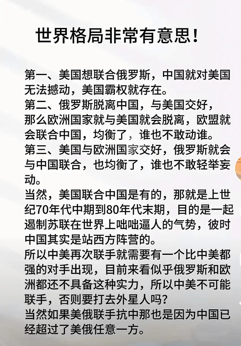 合纵连横,老祖宗两千多年前就已经玩过了。最终还是大秦统一了天下。所以,综合国力托举下的军事实力才是硬道理。这是果,看到的结果。本质是不会让一家独大,这是人性的危机感和嫉妒心。联合起来解决外部问题了必定内讧,然后又组合…。国际关系是个动态平衡,这种状况已经七八十年了只要中美俄三国不发生战争这种平衡不会被打破的。尽量不战,非要打的话,就都在日本决战试一下行了,不许出界。