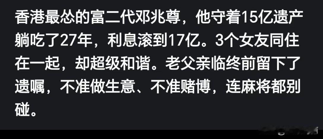 香港最怂的富二代邓兆尊,他守着15亿遗产躺吃了27年,利息滚到17亿。3个女友同住在一起,却超级和谐。老父亲临终前留下了遗嘱,不准做生意、不准赌博,连麻将都别碰