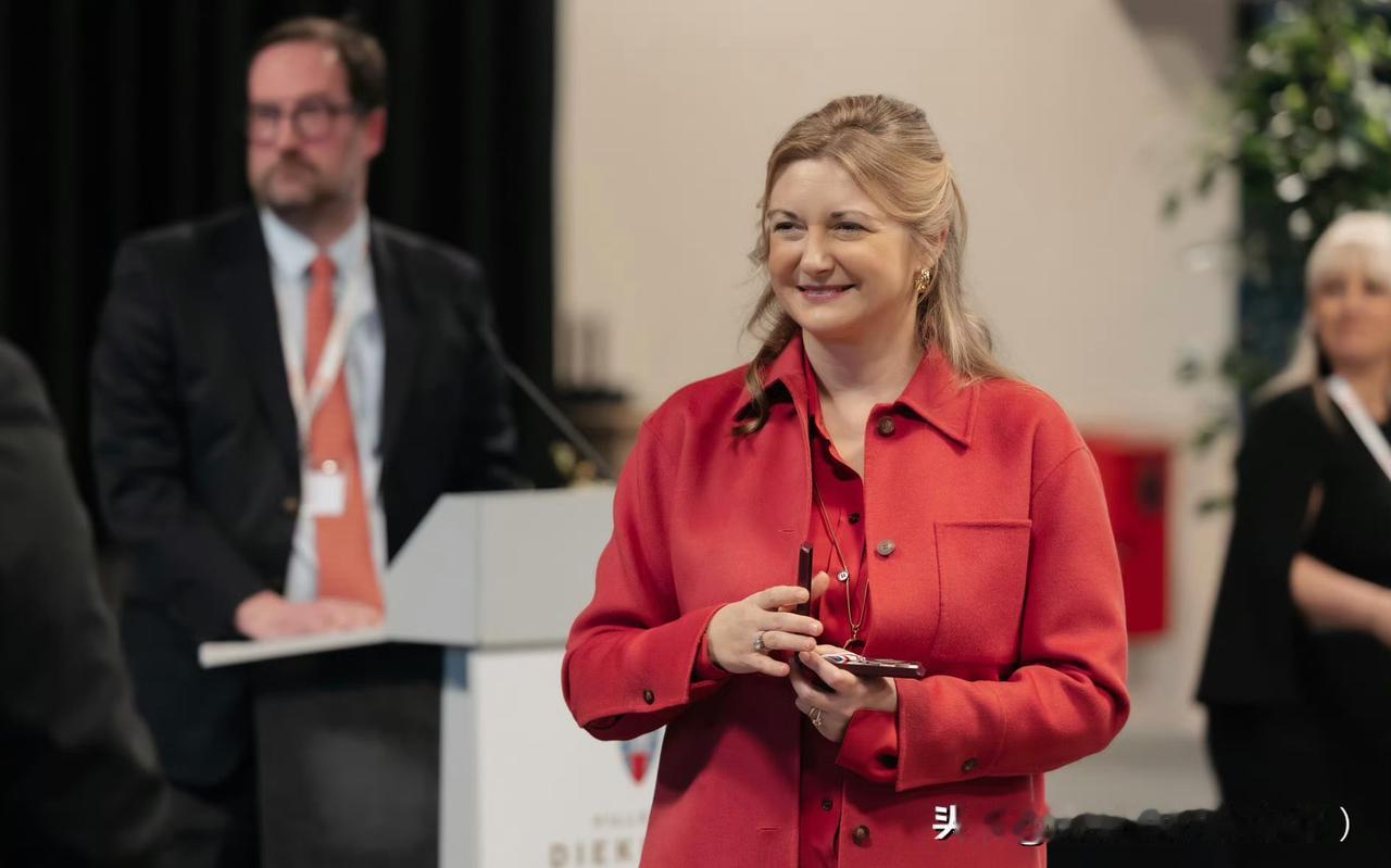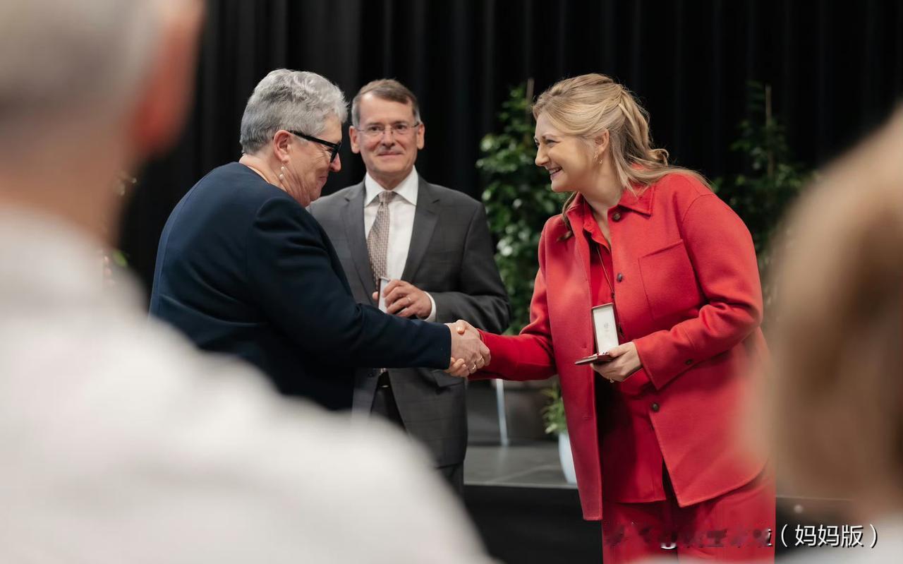 斯蒂芬妮大公夫人为献血者颁发勋章!西瓜红套装太衬气质了!越来越温柔!