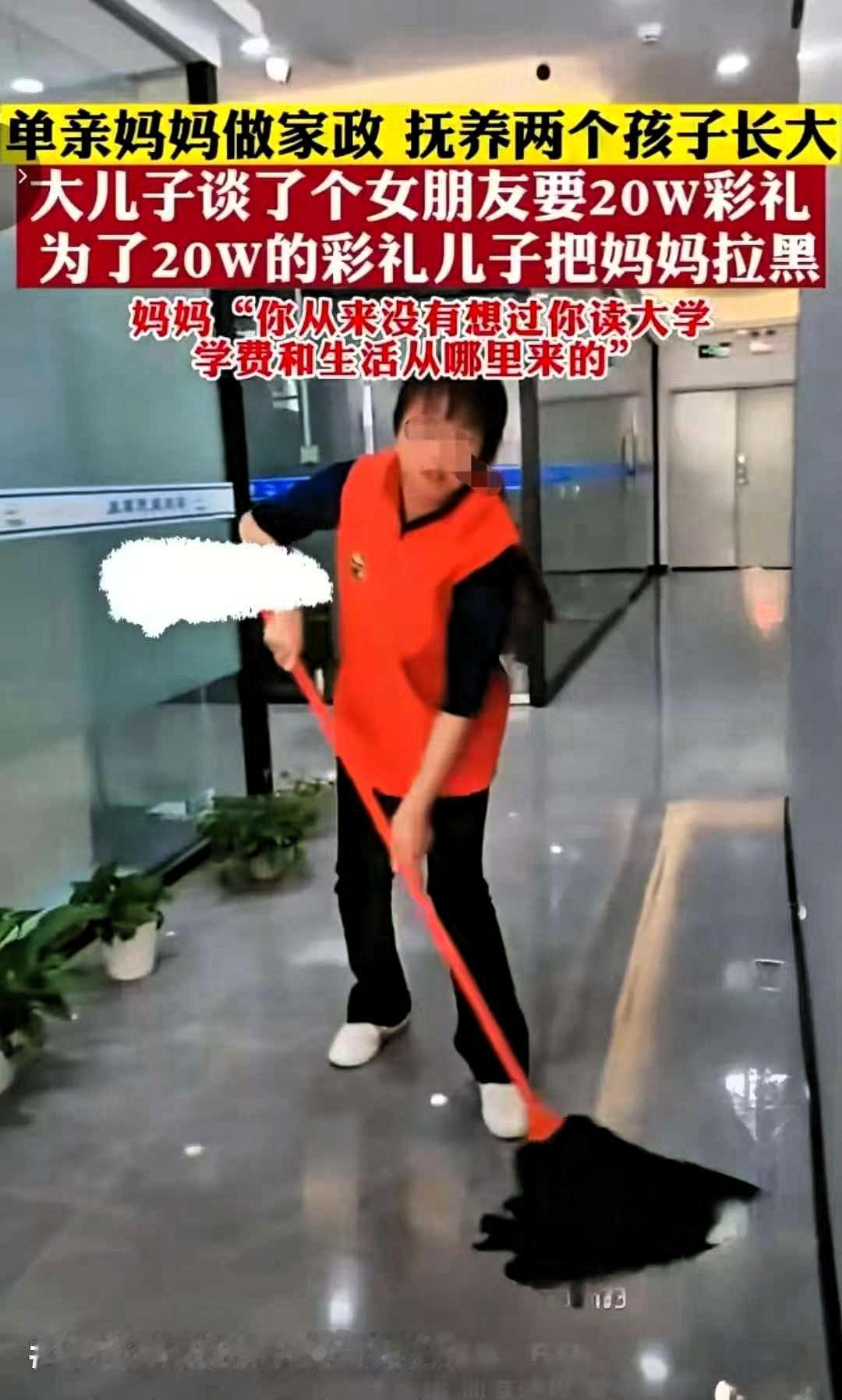 可怜天下父母心,单亲妈妈做家政,抚养两个孩子,大儿子读大学的学费和生活费,全是她起早贪黑挣来的血汗钱,可就因为拿不出20万彩礼,大儿子直接拉黑了亲妈,这份凉薄,真的让当妈的寒透了心。 妈妈一句心酸的质问,道尽了所有委屈:你从来没想过,上学的学费生活费哪来的?是啊,普通家庭的每一分钱都来之不易,更何况是单亲妈妈独自支撑,她拼尽全力给孩子最好的,从没想过换来的是这样的结果。 孩子只想着自己的婚事,却忽略了母亲的难处,忘了这些年母亲为他的付出,这份不懂体谅,比没钱给彩礼更让人心寒。 其实这不是个别现象,很多父母一辈子都在为孩子操劳,省吃俭用、倾尽所有,却渐渐让孩子把这份爱当成了理所当然,忘了感恩,也不懂换位思考。养孩子是父母的责任,但这份责任不是无底线的付出,更不是牺牲自己的一切去满足孩子的所有要求。 这代父母真的该想开点,把孩子养大成人就尽到了本分,不必对孩子奢求太多,更别把自己的一生都绑在孩子身上。余生多心疼心疼自己,吃点好的、穿点暖的,把自己的日子过好,比什么都重要。毕竟父母的爱需要被珍惜,而不是被肆意消耗。