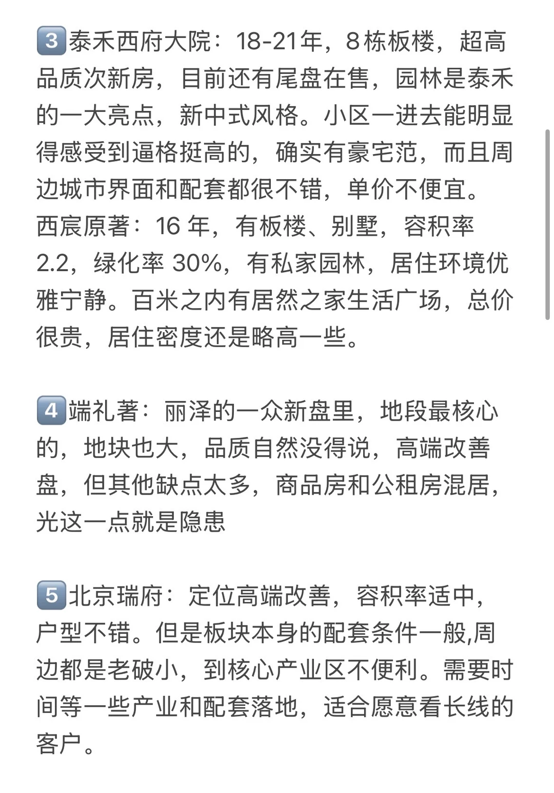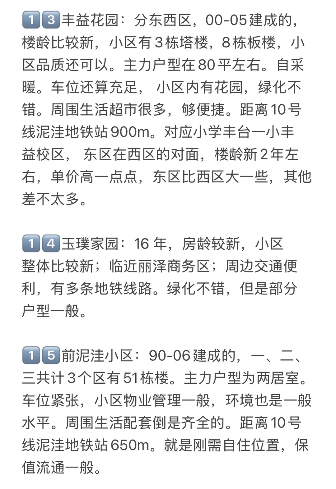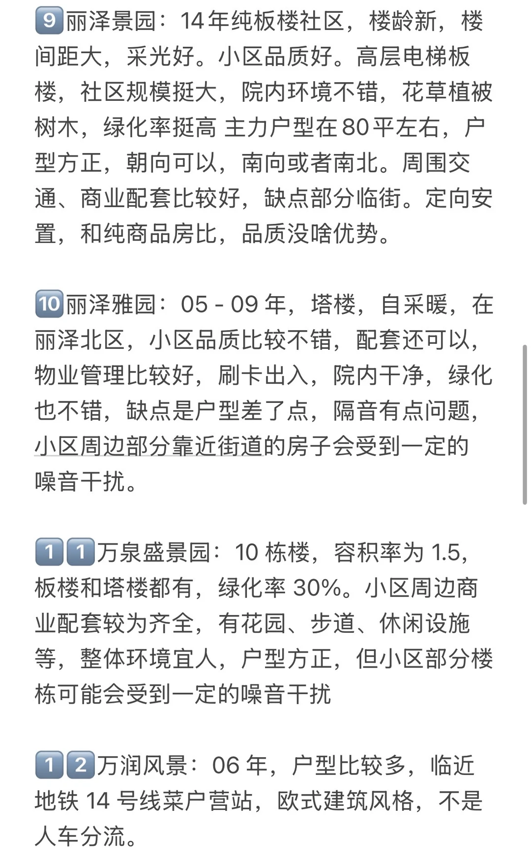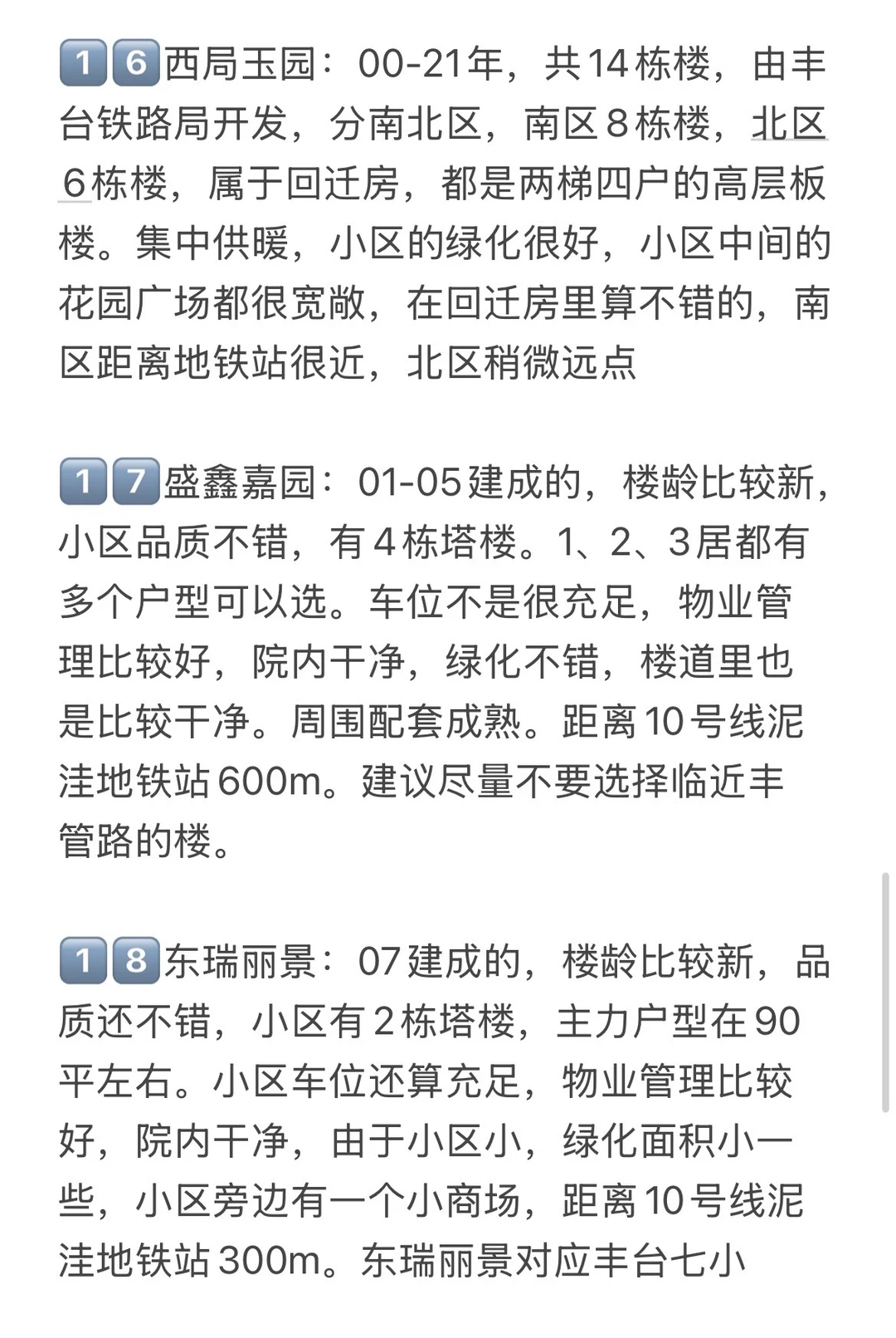 3️⃣丽泽景园:14年纯板楼社区,楼龄新,楼间距大,采光好。小区品质好。高层电梯板楼,社区规模挺大,院内环境不错,花草植被树木,绿化率挺高 主力户型在80平左右,户型方正,朝向可以,南向或者南北。周围交通、商业配套比较好,缺点部分临街。定向安置,和纯商品房比,品质没啥优势。