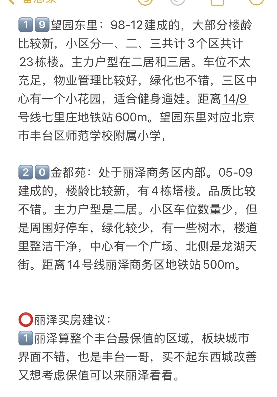 4️⃣丽泽雅园:05 - 09 年,塔楼,自采暖,在丽泽北区,小区品质比较不错,配套还可以,物业管理比较好,刷卡出入,院内干净,绿化也不错,缺点是户型差了点,隔音有点问题,小区周边部分靠近街道的房子会受到一定的噪音干扰。