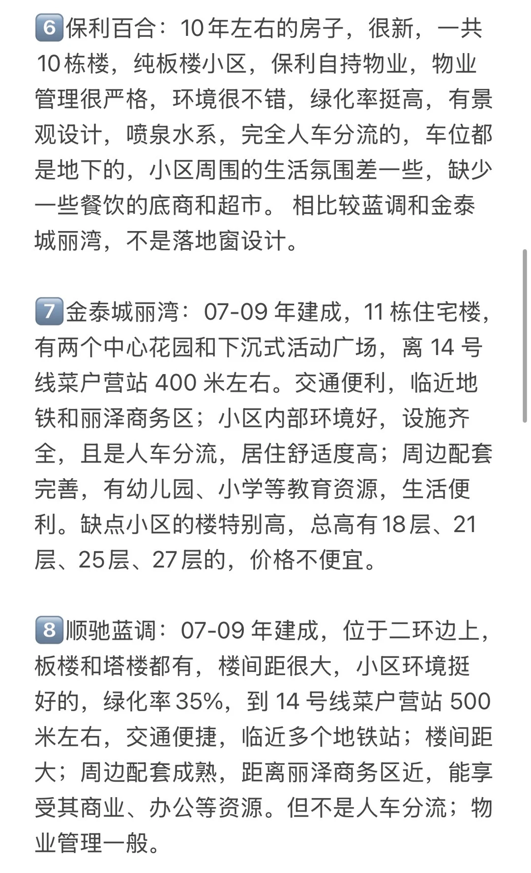 1️⃣ 金泰城丽湾:07-09 年建成,11 栋住宅楼,有两个中心花园和下沉式活动广场,离 14 号线菜户营站 400 米左右。交通便利,临近地铁和丽泽商务区;小区内部环境好,设施齐全,且是人车分流,居住舒适度高;周边配套完善,有幼儿园、小学等教育资源,生活便利。缺点小区的楼特别高,总高有18层、21层、25层、27层的,价格不便宜。