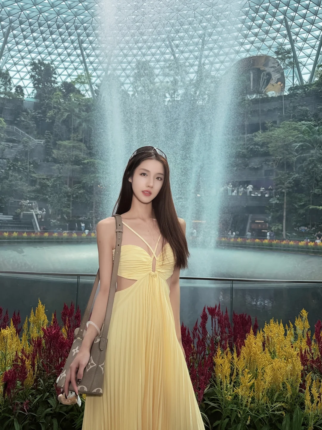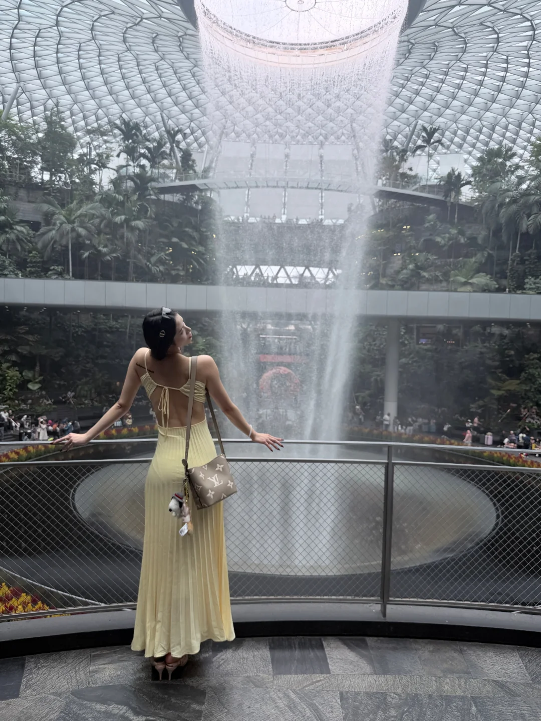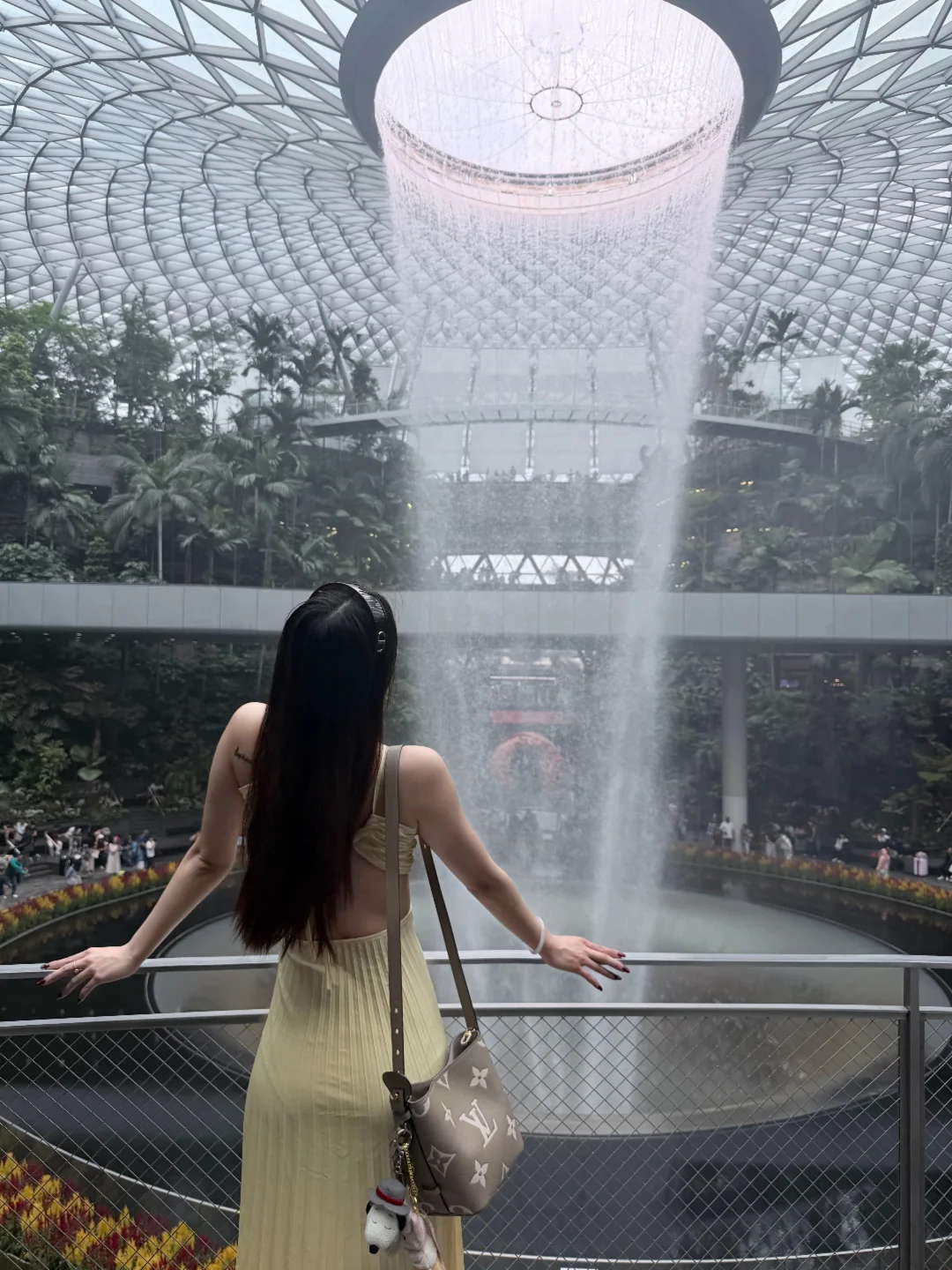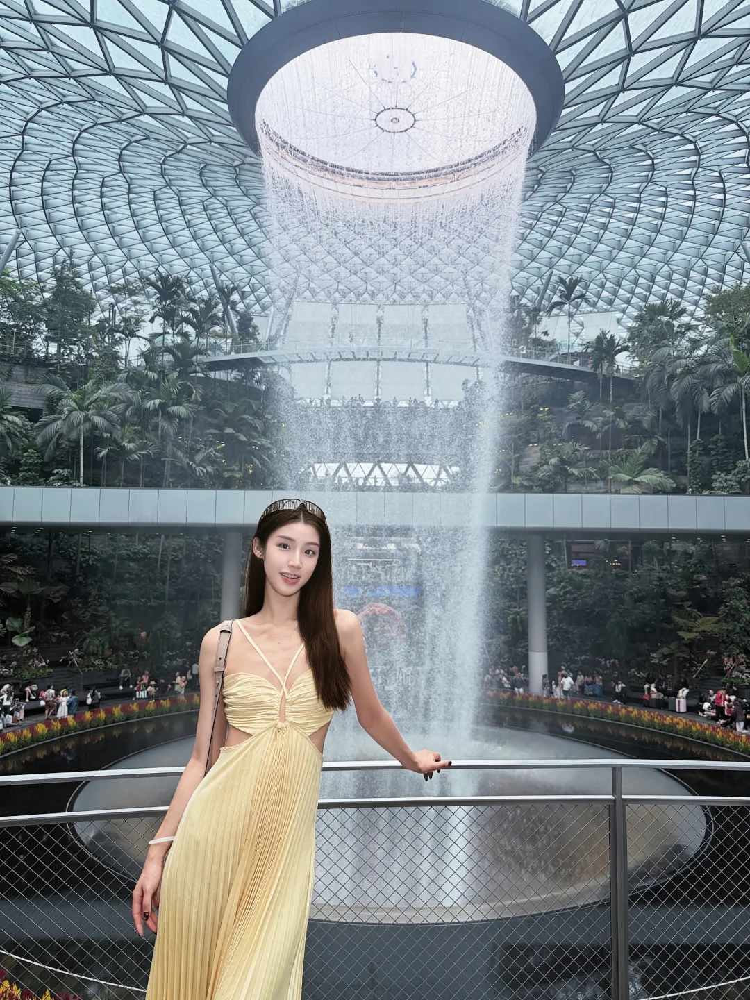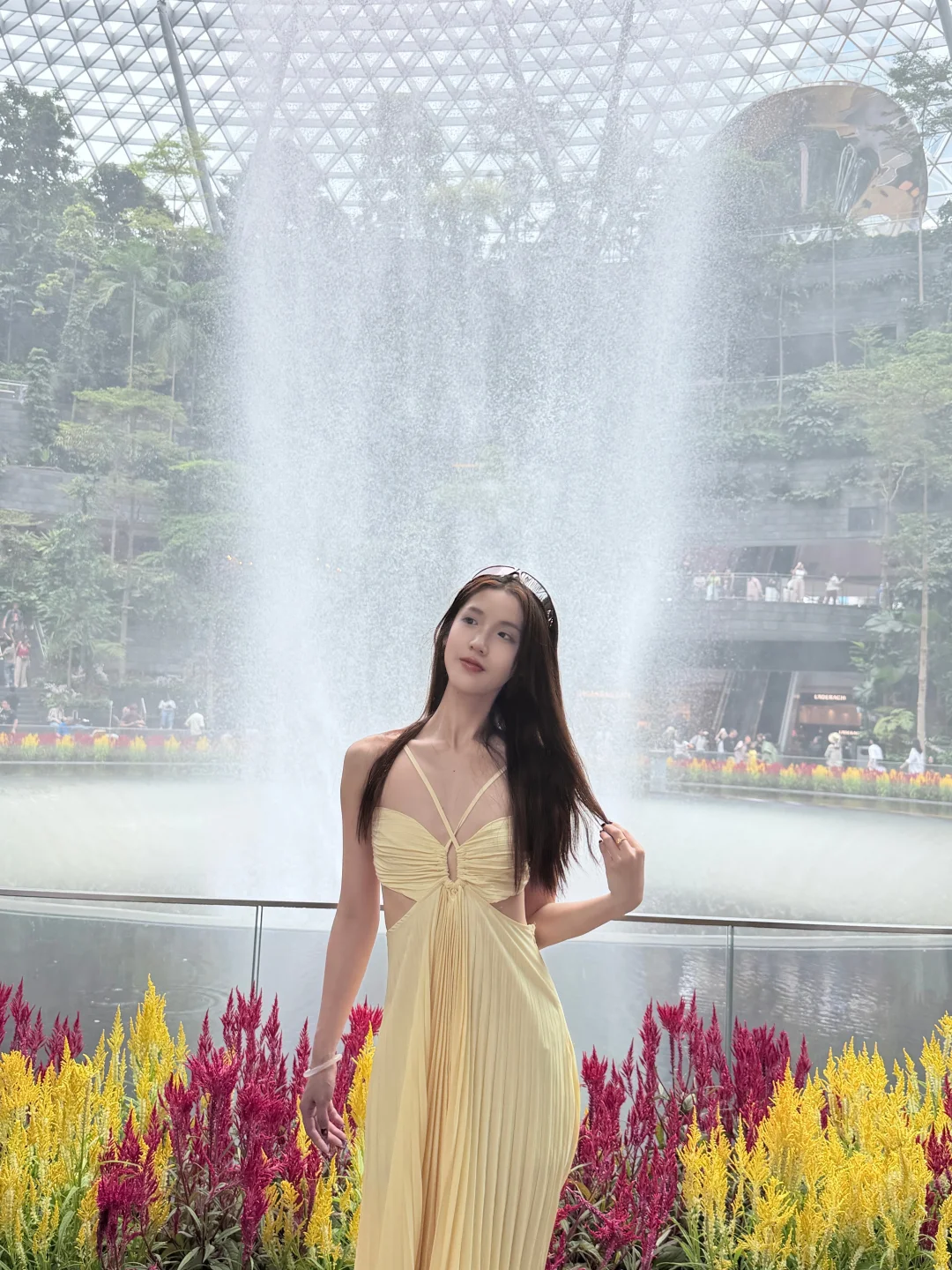 高个子穿搭 坐飞机这么穿 出境 樟宜机场 落地T4 直接跟导示牌找JEWEL商场 可以先去洗手间换上夏装 还是有点热的 建议2楼露台拍瀑布全景