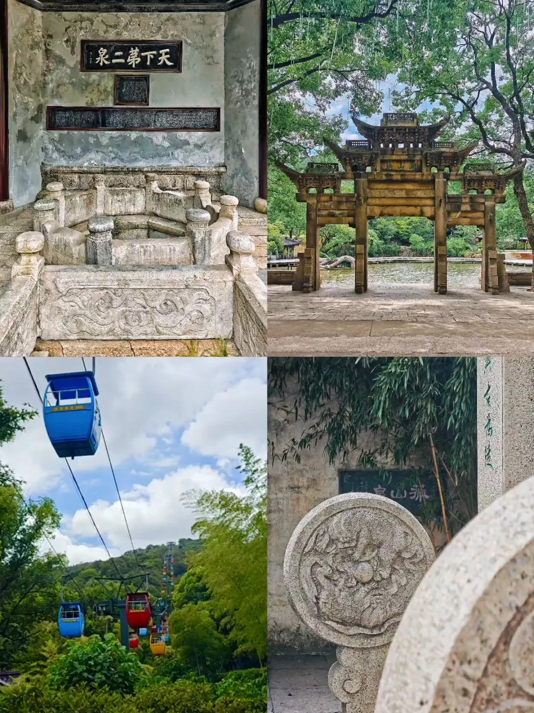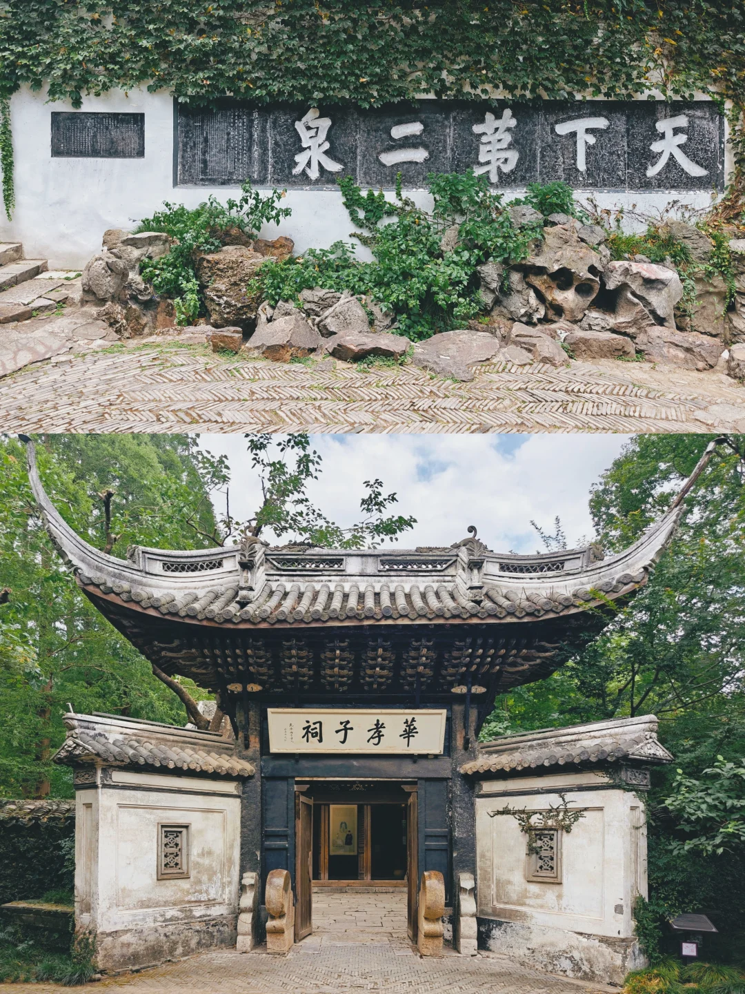 无锡惠山古镇\n🚄1小时左右到无锡站\n🚇地铁3号线转4号线,惠山古镇站6号口下;🚌98路龙光路站下;🚖也很便宜\n🚗自驾2小时左右\n\t\n🕒上午\n文物古迹区:古华山门→寄畅园→二泉书院→惠山寺→天下第二泉→垂虹廊→华孝子祠→印心石屋→阿炳墓→映山湖坊\n🎫70\n\t\n🏯古华山门:乾隆御赐“江南第一山”,唐佛顶尊胜陀罗尼经幢,宋普利院大白伞盖神咒幢\n🏯寄畅园(又名秦园,明代始建,江南四大名园之一,现存建筑多为重建):石匾额(康熙“山色溪光”、乾隆“玉戛金枞”),八音涧,介如峰,锦汇漪(园景布局以山池为中心,将园外景色借入园中,包括锡山的龙光塔)。颐和园中的“谐趣园”即为乾隆当年在清漪园万寿山东北麓仿建的“惠山园”\n🏯二泉书院(无锡现存蕞古老的书院,明正德年间由邵宝创建,目前留存部分清代遗迹,其他为重建):海天石屋,听松坊,点易台\n🏯惠山寺(始建于南朝,多次重建,目前修复为寺院):金莲桥(北宋末年始建,明代大修,无锡蕞古老三孔石梁桥)、听松石床、洪武古银杏、御碑亭、惠山古泉群\n🏯天下第二泉:泉亭后壁赵孟頫书\"天下第二泉”5个大字。惠山泉原名漪澜泉,相传唐代开凿,共两池,上池圆(水都在这里汲取),下池方。“漪澜堂下水长流,暮暮朝朝客未休”,历代无数知名文人墨客来此取水饮茶,留下许多诗词绘画。如故宫博物院藏的文徵明《惠山茶会图》。二胡名曲《二泉映月》亦出于此处\n🏯垂虹廊:伴泉、映月洞门上方爬山游廊,如长龙卧波,连接至锡麓书堂\n🏯华孝子祠(东晋孝子华宝的宗族祠堂,始建于唐,元重建于二泉东侧。现存主体为明永乐至清乾隆):木石结构四面牌坊(无顶亭)、碑廊《真赏斋法帖》摹刻及文徵明《纺绩督课图》、《春草轩辞》\n🏯印心石屋:道光帝赐清嘉道年间的改革重臣两江总督陶澍,他在故乡和任职的两江地区刻了十块\n映山湖坊:清末秦门周氏贞节牌坊,从锡山北麓移建\n\t\n🕐下午\n历史文化街区:西神广场→大照壁→徐孺子祠→张中丞庙→范文正公祠→顾可久祠→杨藕芳祠(升级后特别推荐)→上、下河塘→李公祠→惠山园→宝善桥→中国泥人博物馆(🎫30,不推荐,1楼免费的部分可以看看)\n\t\n惠山古镇核心区约0.3平方公里的范围内,现在仍保存着较为完整的古代祠堂及遗址共一百余处,堪称世界之蕞。\n\t\n⛰️可选择从锡惠公园入口爬惠山,也有缆车可上下(🎫 10;🚠单程40,双程60)\n\t\n