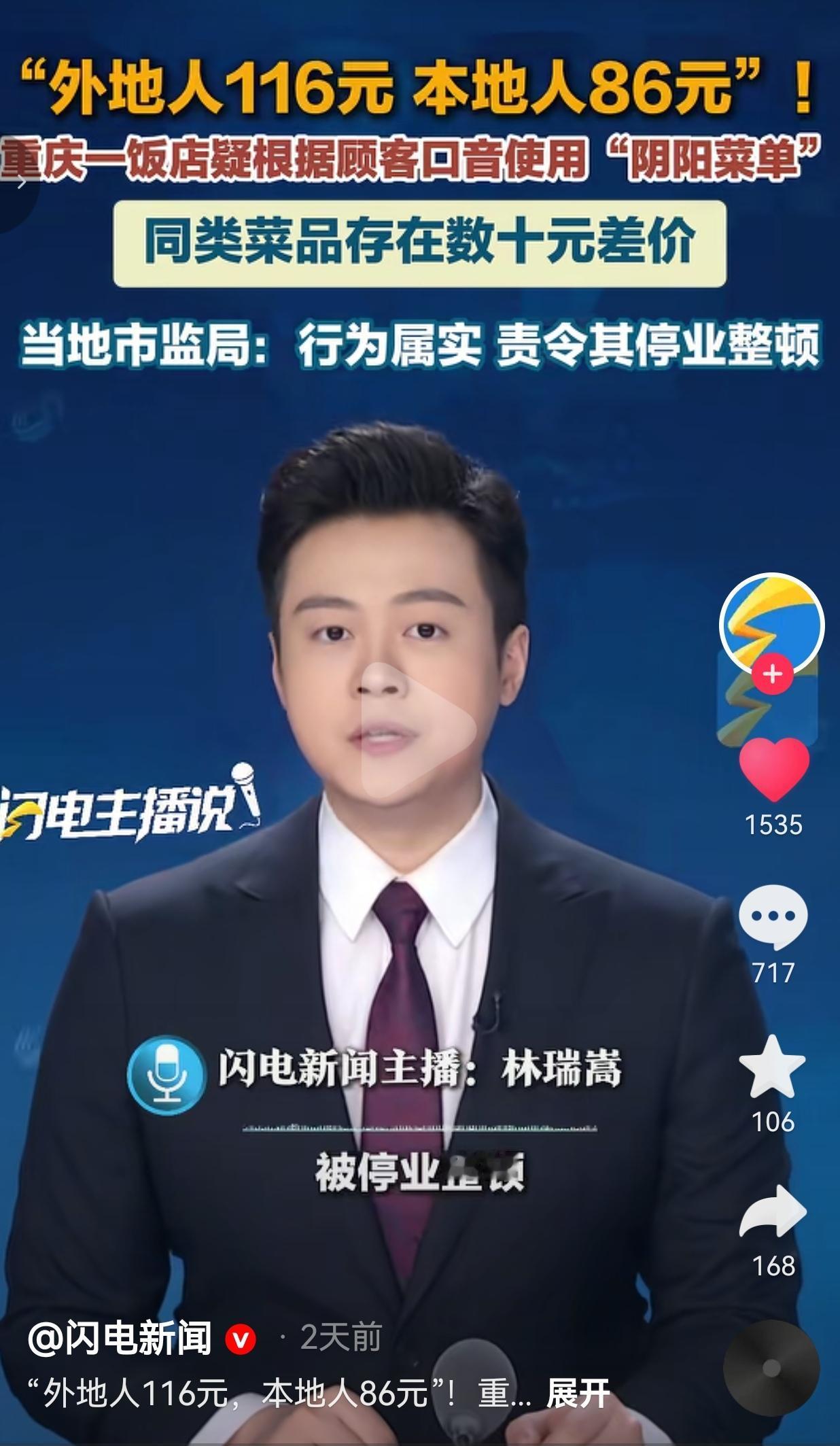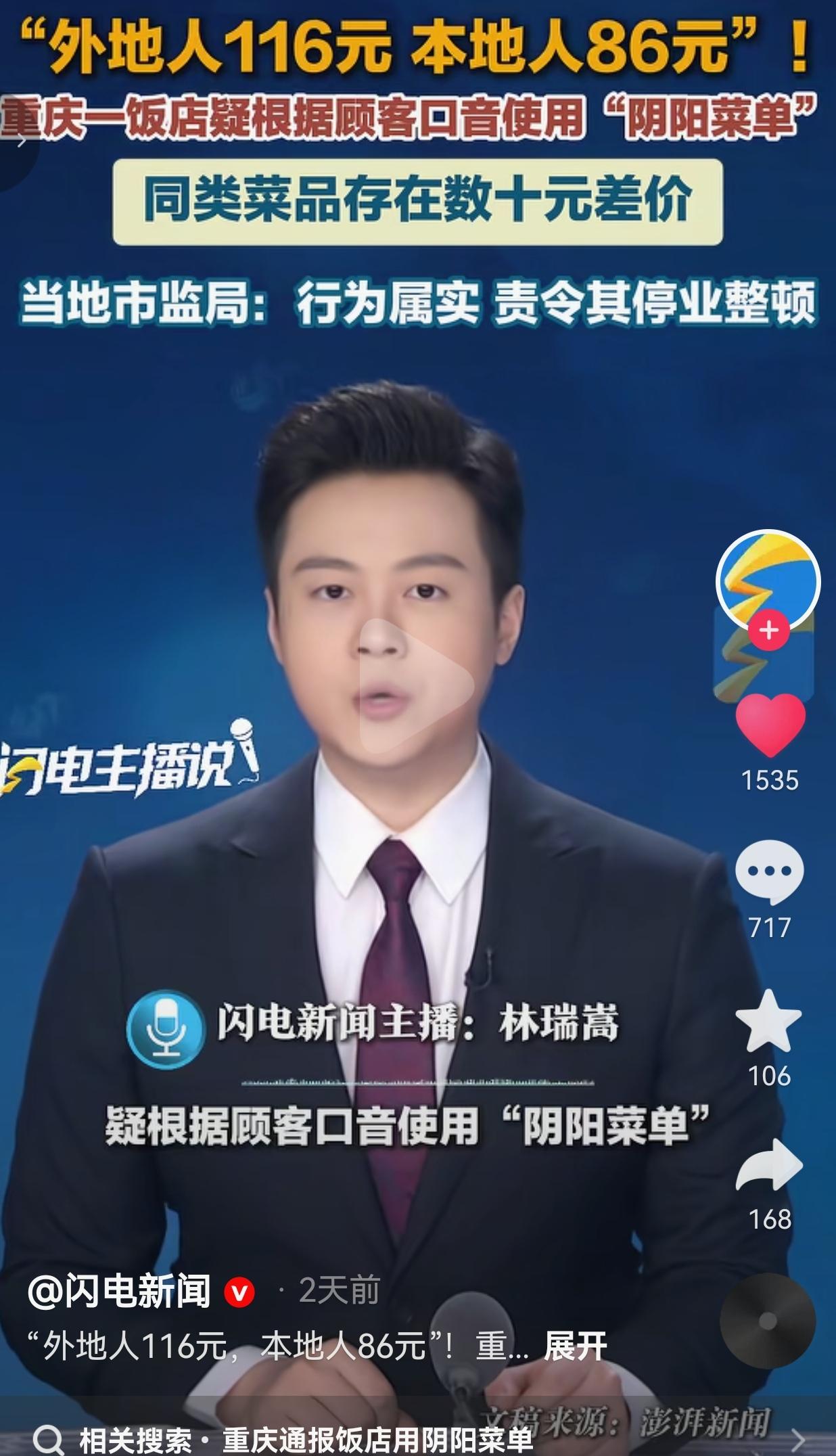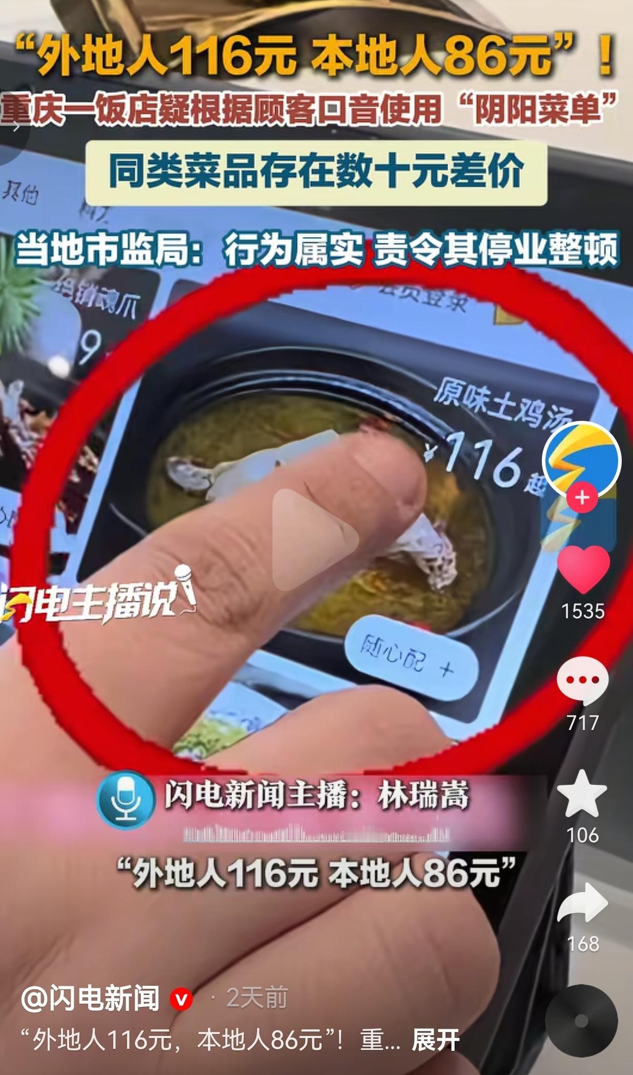 真会玩!这不是明摆着欺负外地游客吗?都是中国人,中国人何必欺负中国人呢? 近日,一网友在网上发视频称,自己在重庆一家饭店吃饭,竟然搞出了阴阳菜单,当时他点了一份原味土鸡汤,本地人去点就是86元,但是,如果老板听到是外地口音的顾客,直接涨到116元。 这不是明摆着欺负人吗?难道就因为你说的不是重庆话,就要平白多掏30块钱? 从网友晒出的两张结账单就能看得明明白白:一张单上“原味土鸡汤(半只)”单价是116元,另一张单上同款菜就是86元。这已经不是单纯的价格歧视,这是把外地游客当“冤大头”宰啊! 外地游客来重庆旅游,也是为了看风景、尝美食、放松心情的,不是为了来给某些黑心商家送钱的。 这家店的做法,不仅寒了游客的心,更是给重庆这座网红城市抹了黑。 好在当地市监局看到后,立即启动核查程序,1月30日发布了通报,经查,网友反应的情况基本属实,最后,当地市监局直接勒令这家店停业整顿,还要求他们向被宰的消费者退还差价费用。 网友看到后评论说:“这种不讲诚信的店就该直接封了!赚这种黑心钱,难道良心不会痛吗?” 还有重庆网友说:“作为一名重庆人,我都觉得丢人!这种店就是给我们城市抹黑!” 通过这事也给我们提了个醒,有时候多留个心眼,比如进店先看墙上的明码标价,或者让服务员把菜单拿过来,先问清楚价格再下单。遇到报价含糊的,果断换一家。毕竟这家店就是靠听口音给你递不同的菜单,咱们可不能给他们这个机会。 当然了,如果你事后知道被骗了,要果断选择维权,保存好付款记录、聊天记录,直接打12315或者当地的市场监管电话投诉。 毕竟,谁的钱都是辛辛苦苦挣来的,而不是大风刮来的,所以千万不能就这么认栽。你看这次事件里,正是因为有人站出来举报,才让黑心商家不仅被停业整顿,还得乖乖退还多收的费用。 说到底,这种“阴阳菜单”的本质,就是商家利用信息差欺负外地人。我们作为消费者,既要学会保护自己,也要让这些黑心商家知道:宰客的生意,从短期看可以赚黑心钱,从长期看,一定是做不长久的!