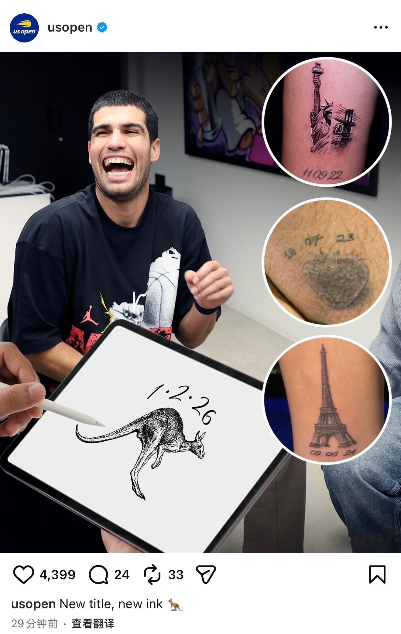 阿尔卡拉斯实现全满贯 笑死,美网ins发了一张图片,预测了阿尔卡拉斯阿尔卡拉斯 身上第四枚纹身以及样式,你认为会是这样的吗?阿尔卡拉斯首夺澳网冠军阿尔卡拉斯大满贯第7冠