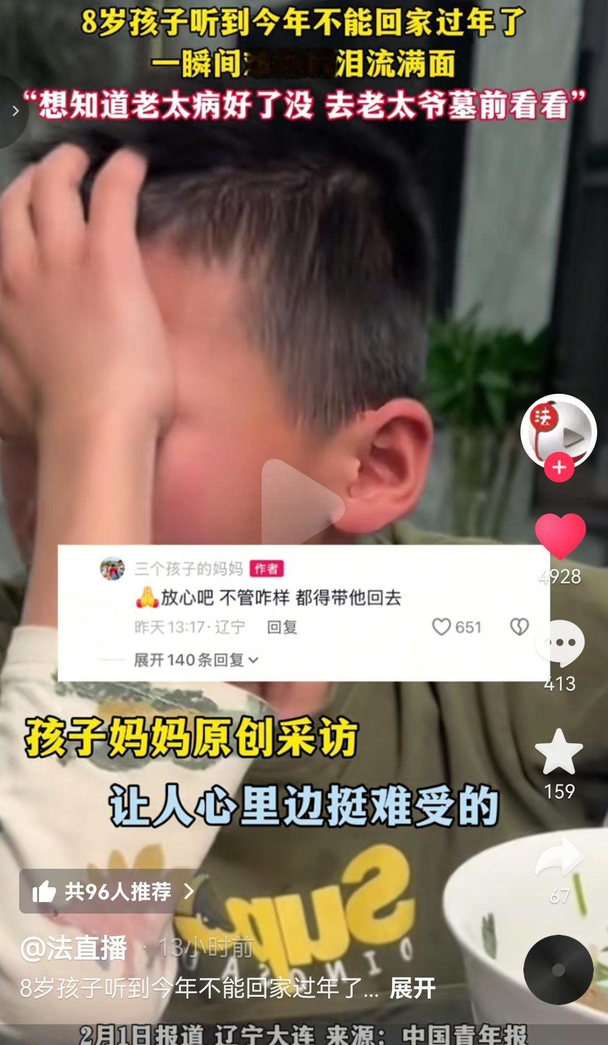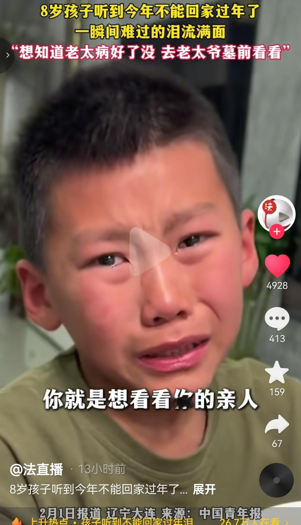 看哭了!孩子都这个样子了,无论怎样也要带孩子回家过个团圆年。近日,辽宁大连,一女子在饭桌上只是想随口跟孩子聊了几句,对孩子说:“今年家里被骗了几十万,手头实在紧,回老家过年也是一笔不小的开支,所以今年就不回去了。” 本以为孩子没有多大反应,毕竟孩子跟父母一起生活,可是,万万没想到的是,孩子听到不回老家过年了,眼泪一下子“唰”地就下来了。 只见他瘪着个嘴,眼睛通红,先是用小手捂住嘴,最后干脆把脸埋进胳膊里,哽咽着说:“我想看看老太,看她病好没好……还想去太爷的坟前看看……” 孩子的话很朴实,可是,这一番话就却像一把小锤子,一下下敲在妈妈的心上。 他可能不懂“被骗几十万”是什么概念,也不懂“没钱回家”的难处,他只知道:老家有生病的老太,他想亲眼确认奶奶是不是真的好了。太爷已经不在了,他想在过年的时候去坟前磕个头,跟太爷说说话。 此事发到了网上,有的网友说:“带孩子回家过年吧!大不了少花点钱,也要满足孩子的心愿。” 妈妈对此事做出了回应,孩子的妈妈说:“放心吧,不管咋样,都得带他回去。” 还有的网友说:“这孩子太懂事了,哭的时候都只是哽咽,没有撒泼,这份牵挂真的太珍贵了。” 我想,在孩子的世界里,过年的意义从不是多么丰盛的年夜饭,也不是绚烂的烟花,而是“回到亲人身边”。 他的眼泪里,没有抱怨,只有纯粹的想念和遗憾,想念那个疼他的奶奶,也想念再也见不到的太爷。 其实我们都懂,成年人的世界里,根本不是不想回家过年,而是真的没有办法回家过年,比如说没钱、没假、没勇气面对生活的一地鸡毛。 可是,这些难处在孩子眼里,都比不上回家过年的执念。 这个孩子让我们明白:真正的年味,从来不是丰盛的年夜饭,也不是绚烂的烟花,而是能和想念的人在一起,能去看看牵挂的人,能给逝去的亲人磕个头。 我们每个人都在为生活奔波,总在说等明年有钱了,风风光光地回家过年,可是,我们却忘了有些等待真的拖不起,因为家里的老人年纪大了,不知道什么时候就不再了。 所以说,无论如何,过年了,也得回趟家看看,陪家里老人过个幸福的团圆年。