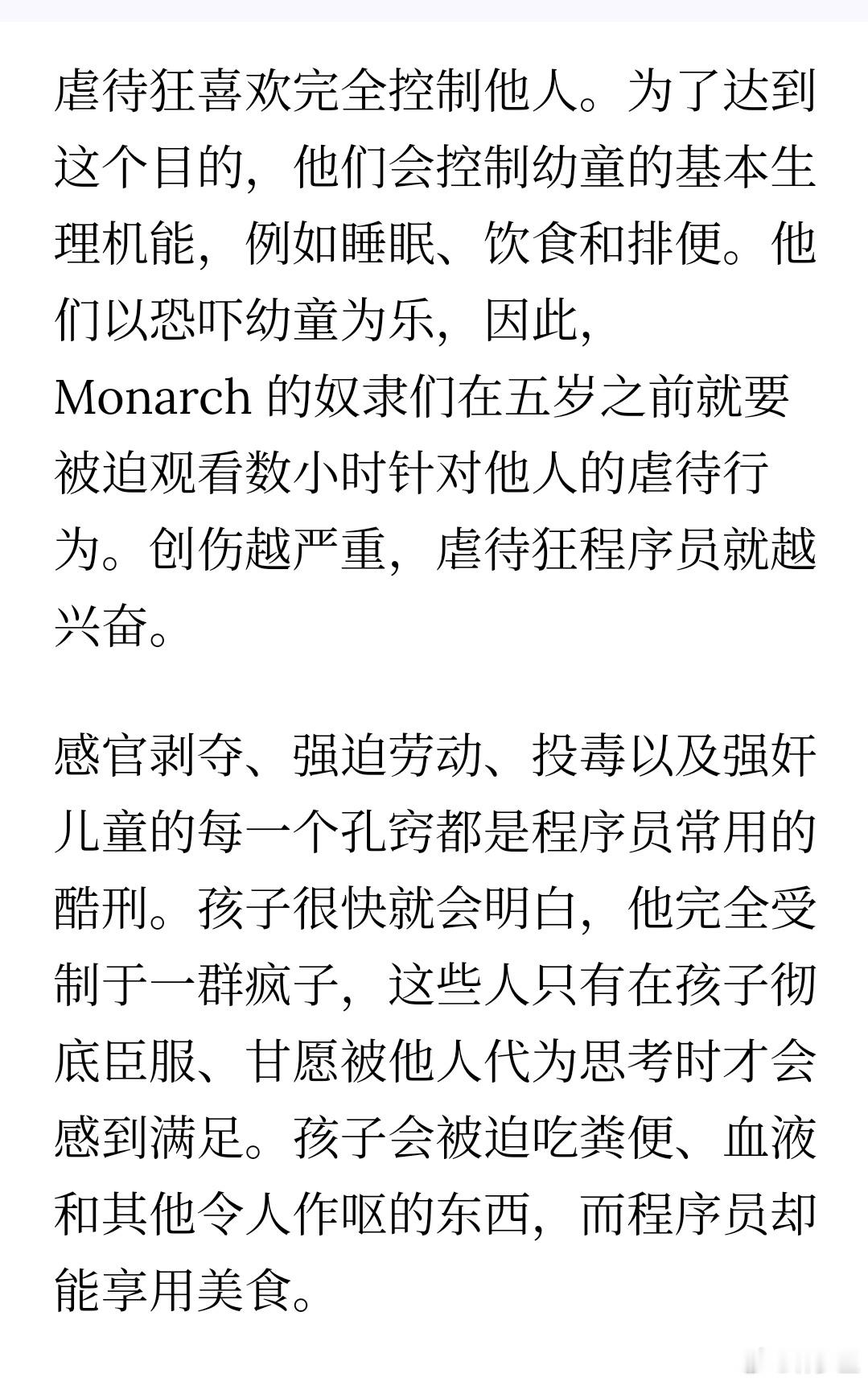 他们通过精神控制系统性的编程,或者叫仪式性的虐待,让小小的孩子彻底奴隶化/性化。