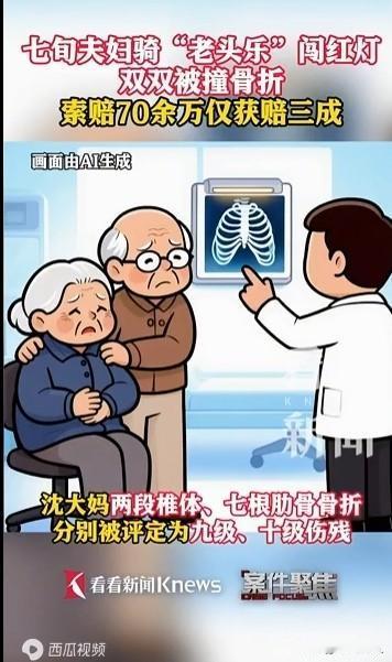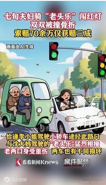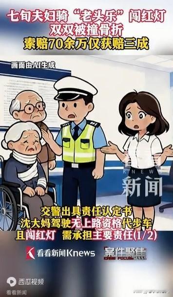 七旬老夫妻骑“老头乐”闯红灯被撞骨折,索赔70多万。 据媒体2月2日报道,上海七