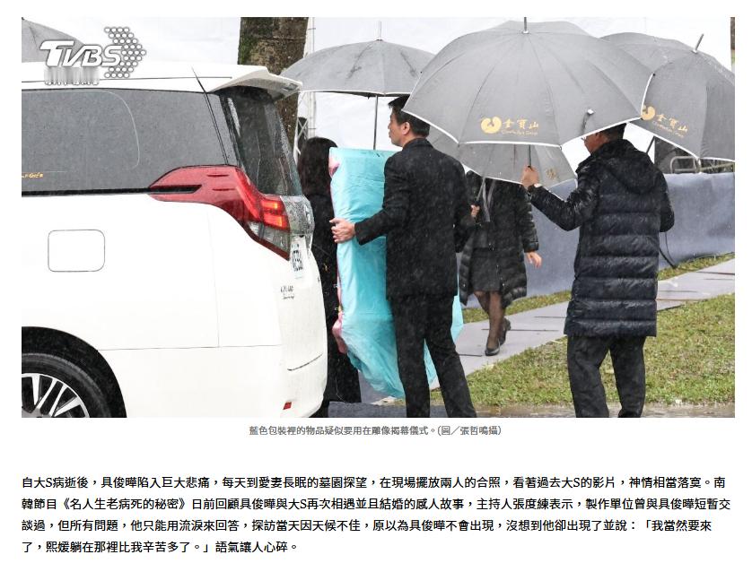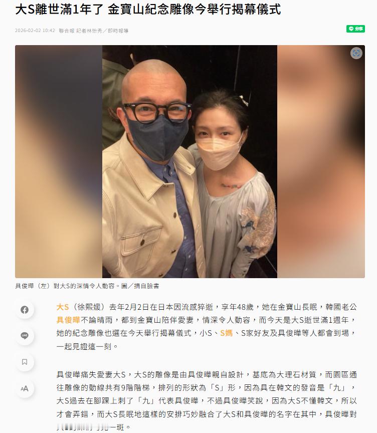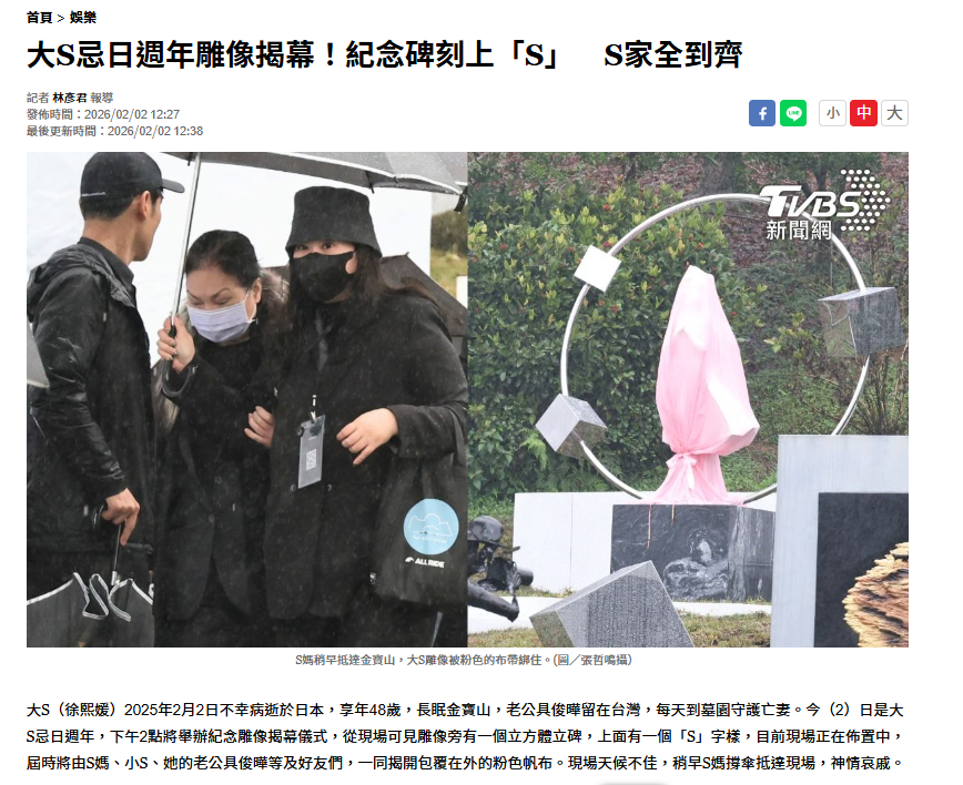 【大S纪念雕像揭幕】S妈小S具俊晔为大S雕像揭幕 2月2日是大S逝世一周年,大S纪念雕像揭幕仪式将于今日下午举办,据台媒报道,现场可见雕像旁边有一立方体立碑,上面有一个“S”字样,目前现场正在布置中,届时将由S妈、小S、具俊晔等人一同揭开包裹在外的粉色帆布,S妈稍早已抵达现场。据了解,大S纪念雕像由具俊晔亲自设计,基座为大理石材质,园区通往雕像的动线有九阶白色阶梯,排列呈S形。大S过去曾为了具俊晔在脚踝上刺青“九”,原因是“九”与韩文“具”相同发音,具俊晔笑说,“她不懂韩文,才会弄错。”(TVBS新闻网)