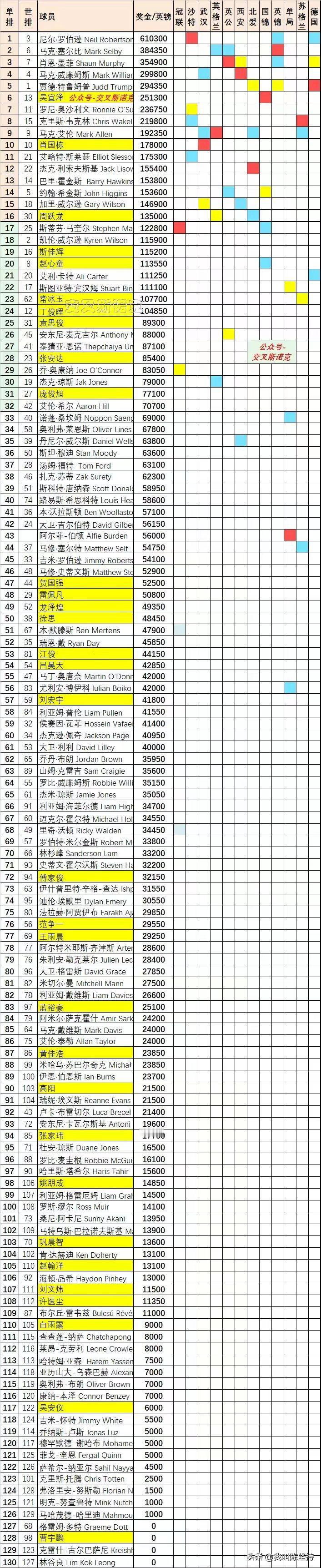 随着特鲁姆普夺得德国大师赛冠军,本赛季渐渐接近尾声。 目前为止排名赛冠军还没有重复的,12个冠军分属不同球员,凯伦威尔逊和赵心童本赛季还没获得排名赛冠军,说明现在属于群雄逐鹿的时代,像丁俊晖和特鲁姆普单赛季拿6-7个排名赛冠军的局面很难出现了。 单赛季排名特鲁姆普升至第5,总排名还是遥遥领先,但是已经不像之前那么有统治力了。 剩余还有6个冠军可以争取,世界大奖赛后确定球员锦标赛的球员名单,也就是单赛季前16的选手,目前中国仅有3人,众多中国球员要好好打世界大奖赛,方能获得门票。